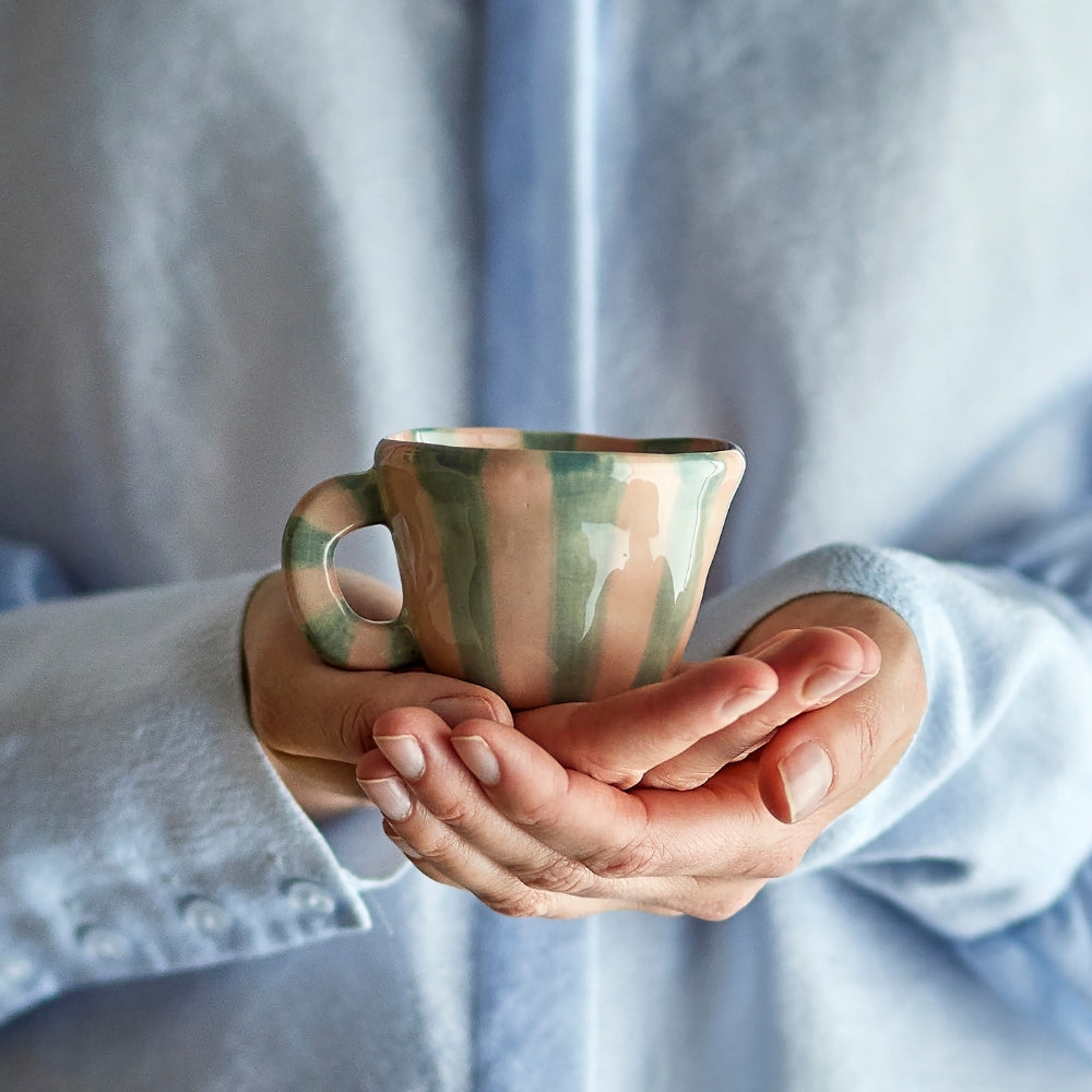 La superficie della tazza è stata decorata a mano con strisce verticali in una tonalità verde tenue, che le conferisce un aspetto unico e artigianale.