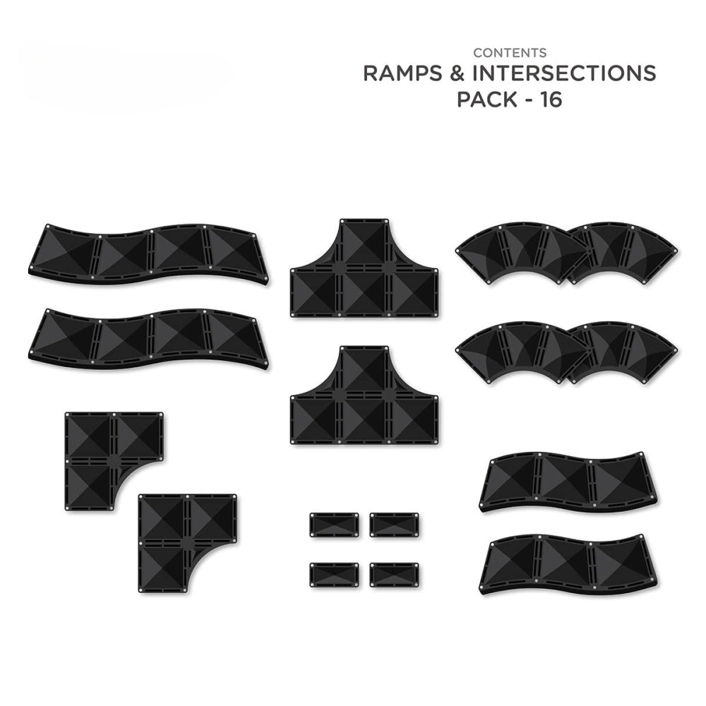Il set Connetix da 16 pezzi Strade, Rampe e Incroci presenta forme uniche di mattonelle magnetiche ispirate alla strada, tra cui quarti di cerchio, curve, incroci e rampe lunghe e corte, il tutto in un'elegante tonalità nera.