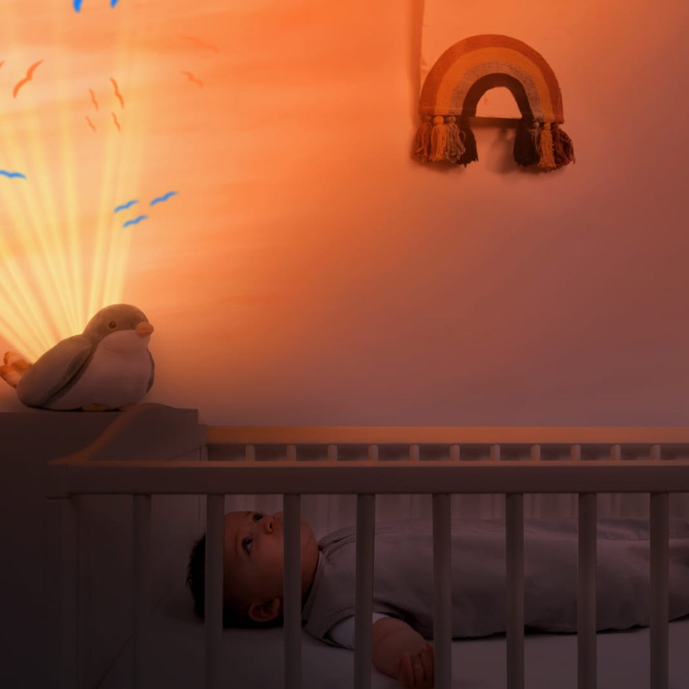 Der Shally Bird Baby-Projektor der niederländischen Marke Zazu ist Spieluhr und Projektor in einem.