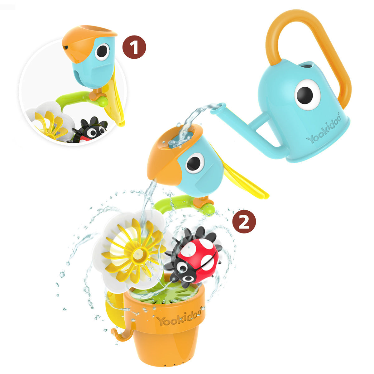 Il gioco da bagno permette di innaffiare i vasi e di osservare la lumaca che spunta, il mulino ad acqua che gira e l'uccellino che si inclina, mettendo in movimento gli elementi.
