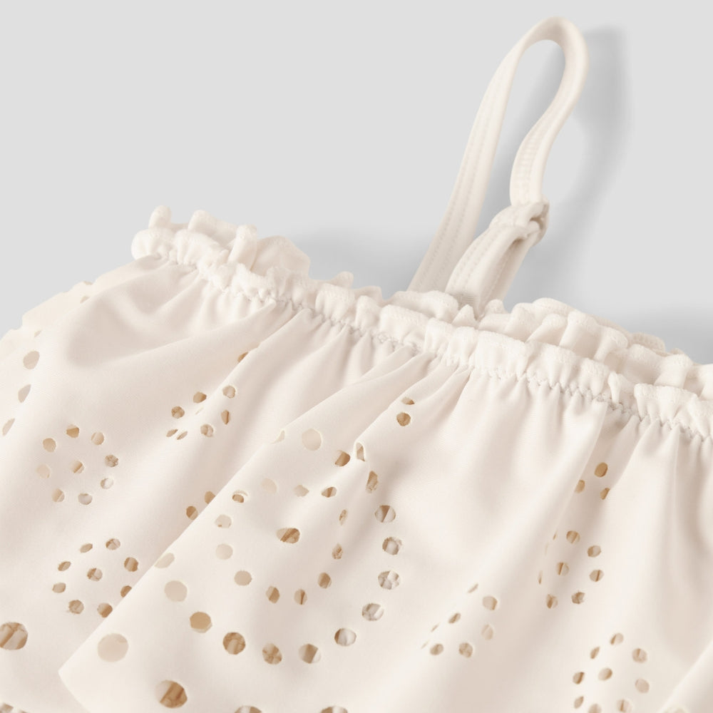 Questo costume da bagno di Lil' Atelier è un modello che unisce stile, comfort e attenzione all'ambiente. Il taglio intero in una morbida tonalità crema è pensato per le bambine che amano giocare in acqua e le giornate estive piene di sole.