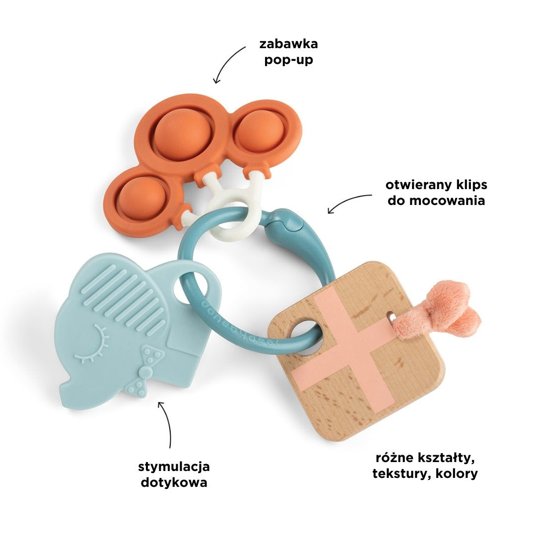 Il set, facile da impugnare e collegato con una clip, rende il giocattolo sensoriale ideale per i viaggi, agganciandolo al passeggino, al seggiolino auto o alla borsa.