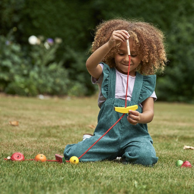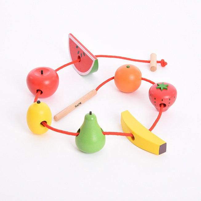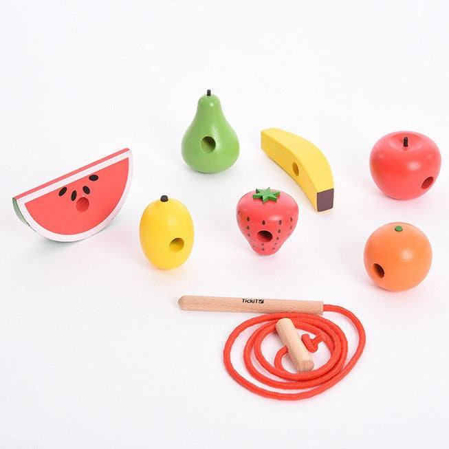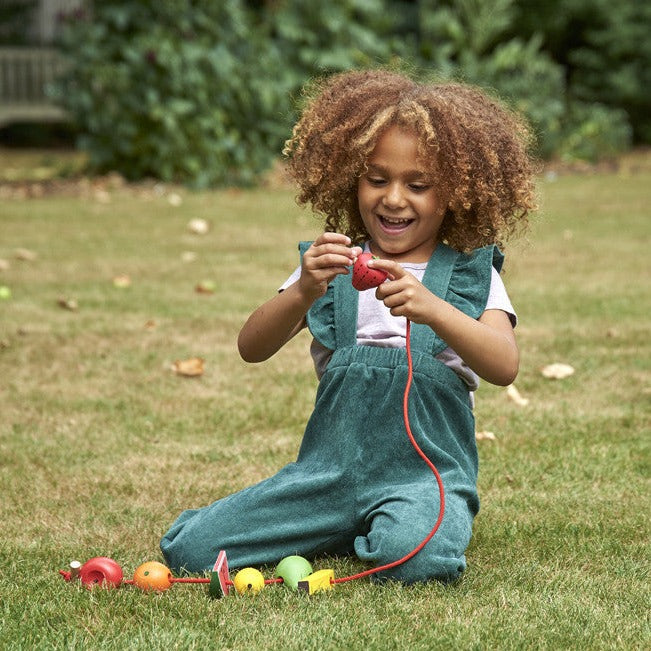 Farbenfrohe Kinder-Obstfädelmaschine aus Häm-Holz mit handbemalten Details von TickiT.