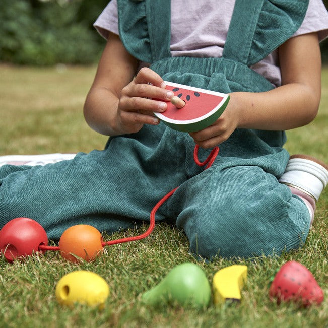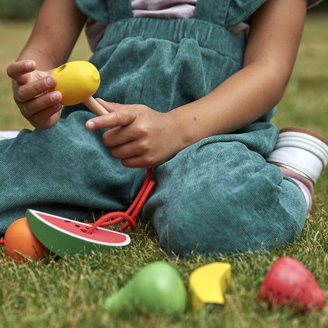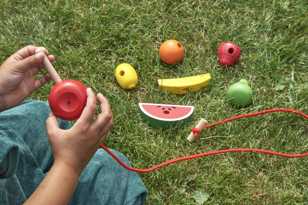 Jede Frucht hat Löcher zum Durchfädeln und zwei Schnüre mit hölzernen Einfädlern und Stoppern, so dass Ihr Kind einzigartige Aufhängungen kreieren kann.