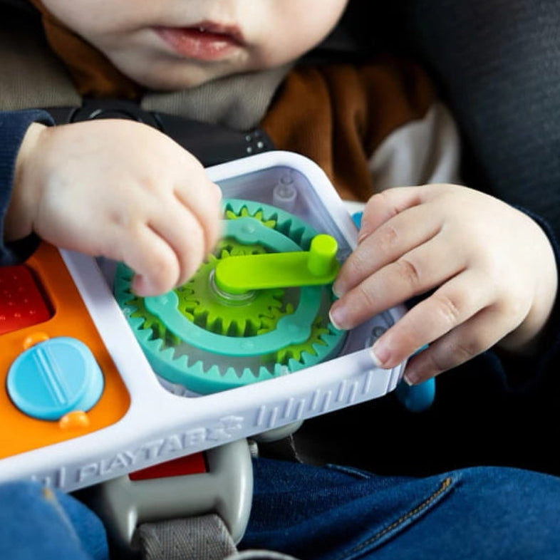 Il quadrato sensoriale PlayTab di Fat Brain Toys con ruote dentate è un giocattolo coinvolgente che invita il bambino a esplorare il movimento, le relazioni e le sensazioni tattili.