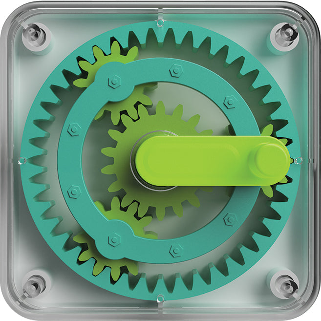 Grazie a un meccanismo azionato da una manovella, il bambino può osservare come la ruota grande muove le tre ruote più piccole, dando molta soddisfazione e incoraggiando la sperimentazione.
