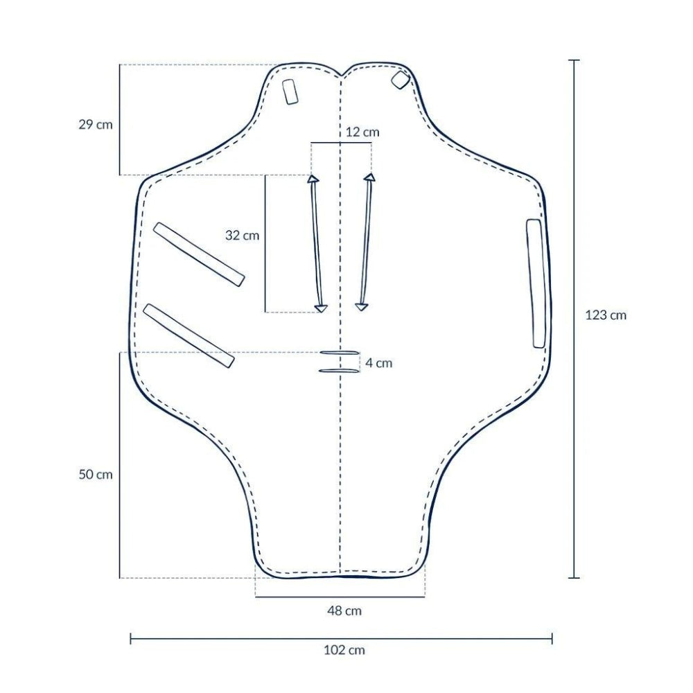 La coperta è dotata di 4 fori per le cinture di sicurezza, di una chiusura in velcro non a pressione per evitare che la coperta si muova e di due cinghie in velcro.