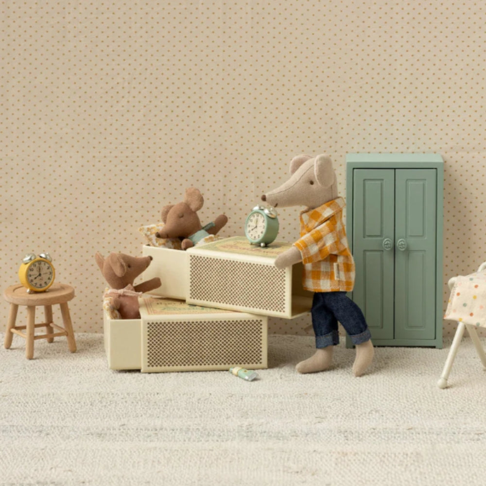 I morbidi tessuti utilizzati per l'abbigliamento e la biancheria da letto sono decorati con motivi sottili e splendidi colori, rendendo ogni Maileg Mouse un compagno unico per le avventure dei bambini.