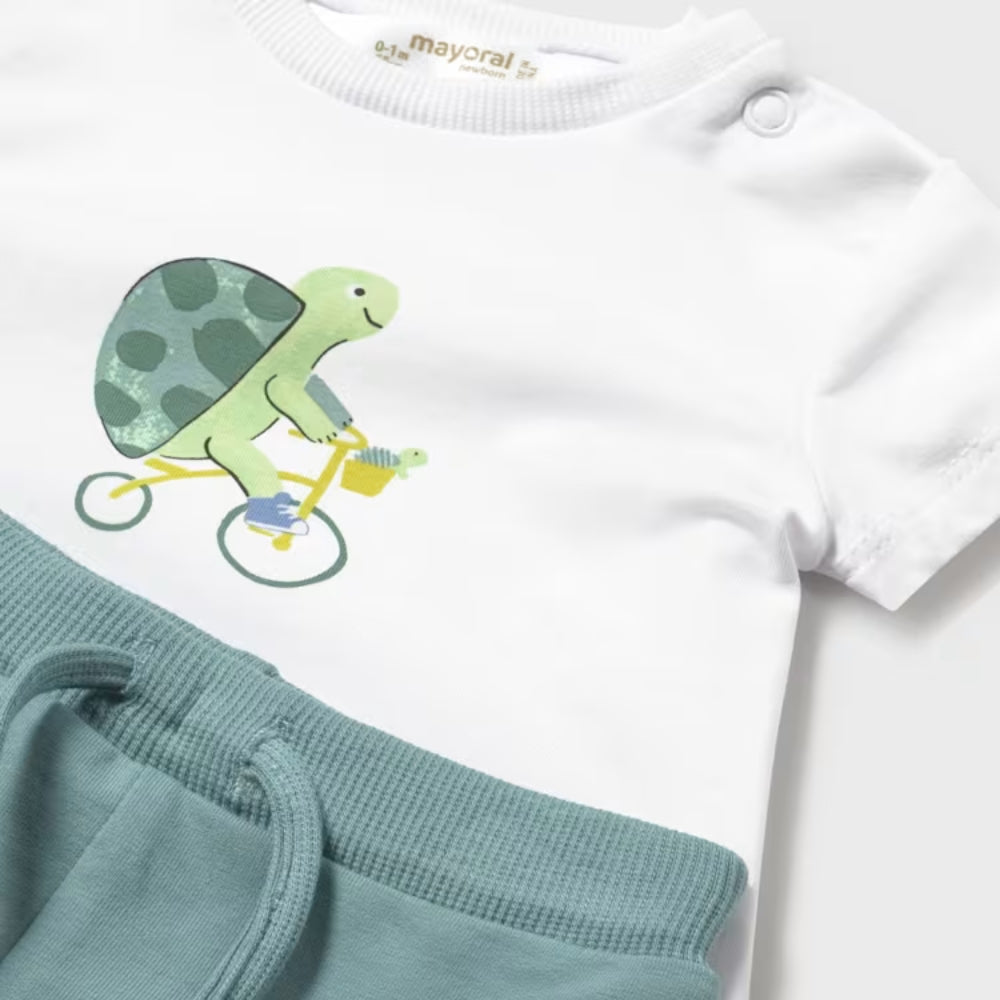 La maglietta a maniche corte è decorata con un motivo a tartaruga, che introduce un tocco infantile e amichevole.