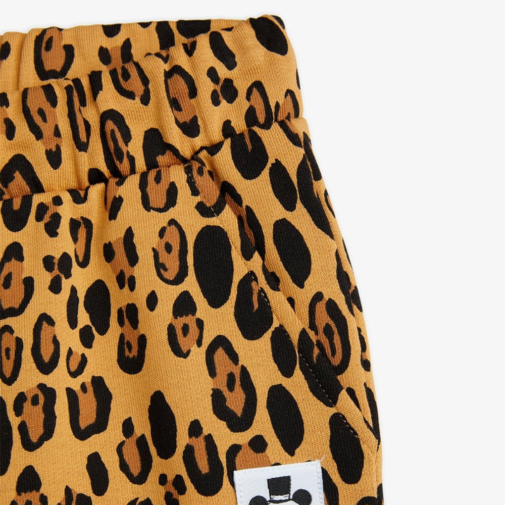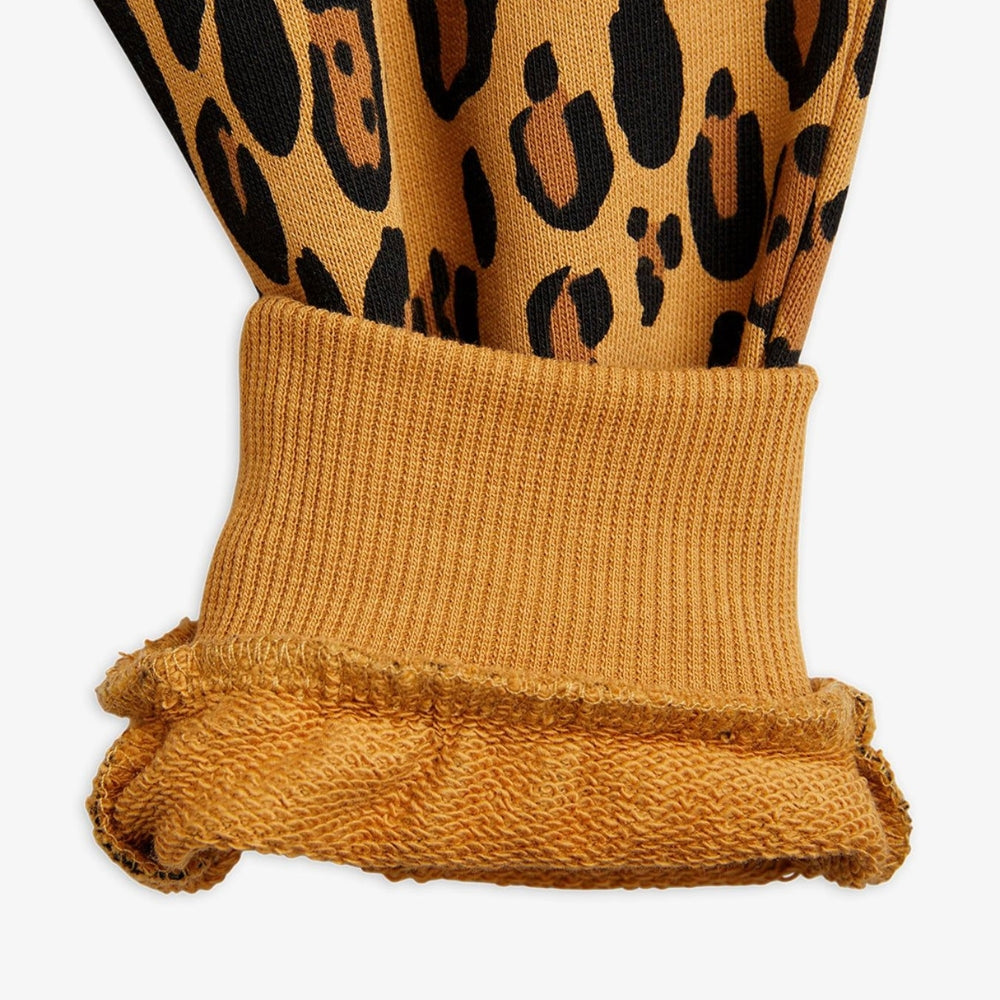 I pantaloni da bambino di Mini Rodini sono comodi pantaloni da tuta di colore beige, ricoperti da una vistosa fantasia leopardata.