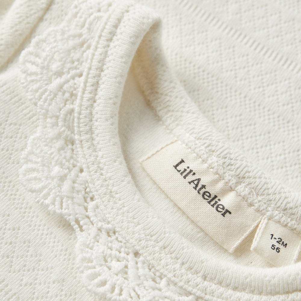 I body per neonati di Lil' Atelier uniscono comfort, qualità e stile senza tempo. Il delicato motivo a coste nei toni del bianco conferisce loro un fascino discreto, mentre la fascia elastica in vita assicura una completa libertà di movimento per i giochi e il relax di tutti i giorni.