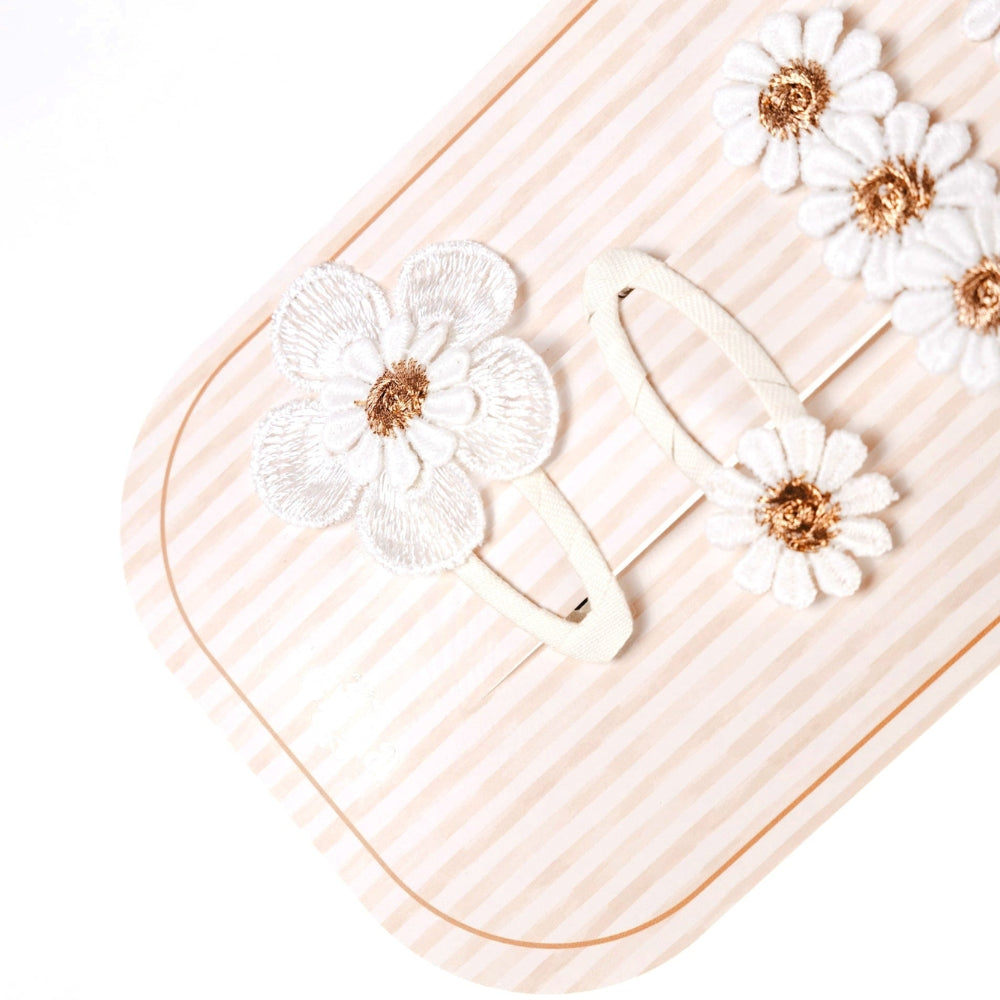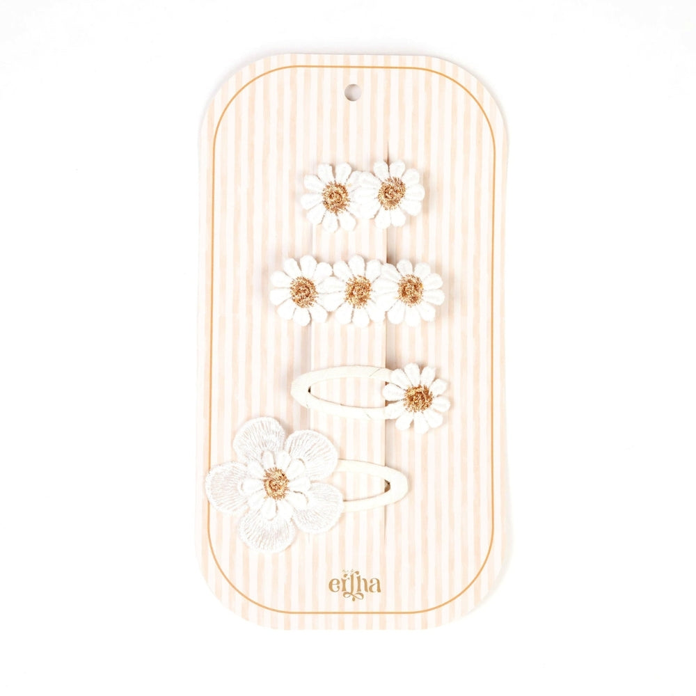 I fermagli per capelli per bambine di Mrs Ertha sono un sottile set di quattro decorazioni per capelli ispirate al fascino delle margherite di campo.