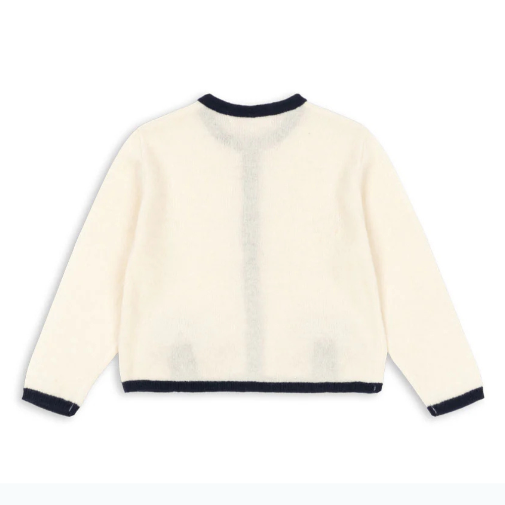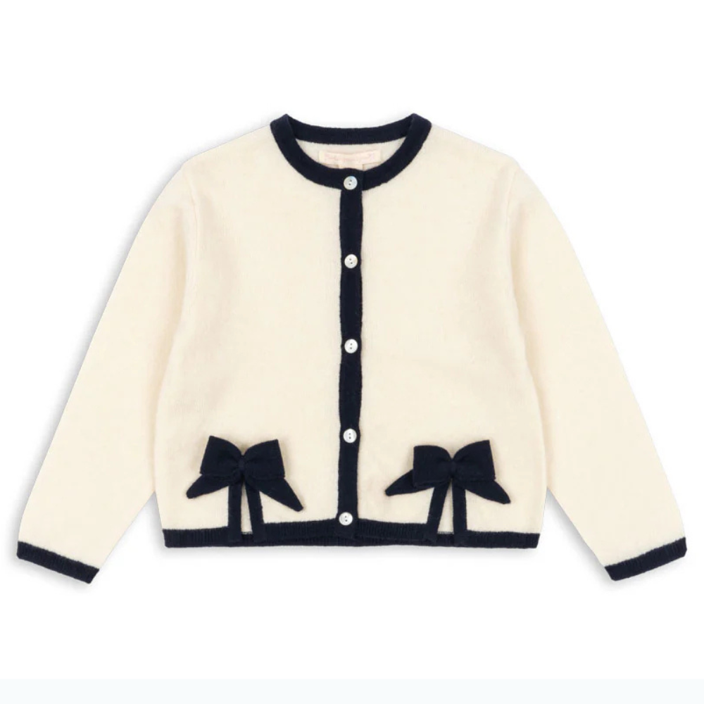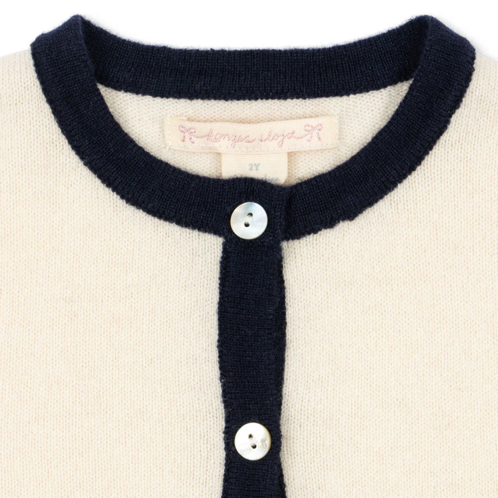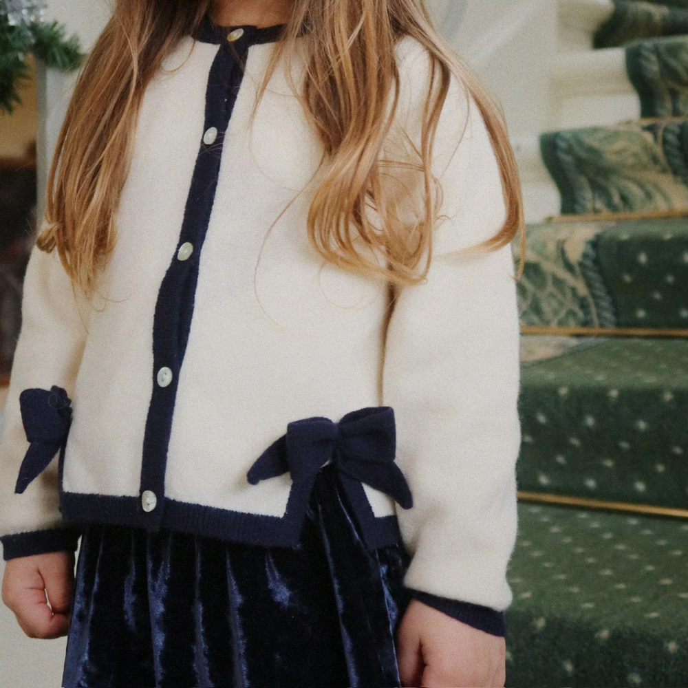 Questo maglione per bambini ha una vestibilità classica con scollo rotondo, profili a contrasto e bottoni in madreperla, delicati fiocchi aggiungono un fascino discreto.
