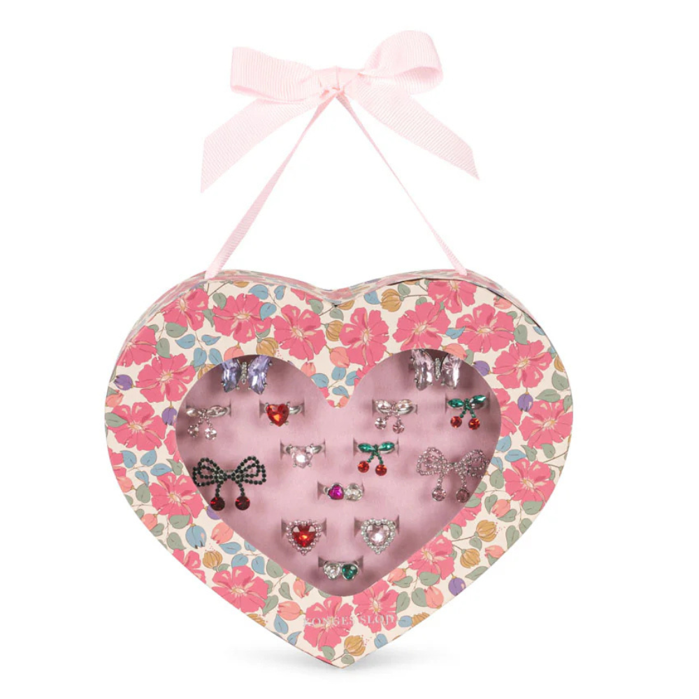La scatola a forma di cuore contiene 14 pezzi diversi: occhi di vetro scintillanti, motivi sottili e dettagli senza tempo tipici di Konges Slojd. Gli anelli regolabili si adattano comodamente alle dita e l'elegante confezione rende il set di gioielli perfetto per un regalo.