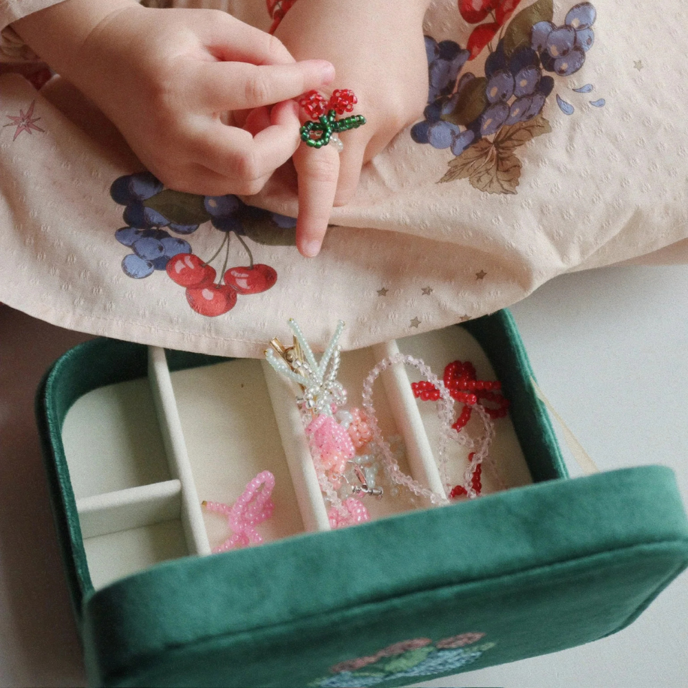 La scatola di velluto nasconde tesori perlati che faranno la gioia dei piccoli amanti dei travestimenti e dei giochi di casa.