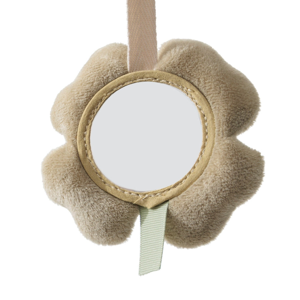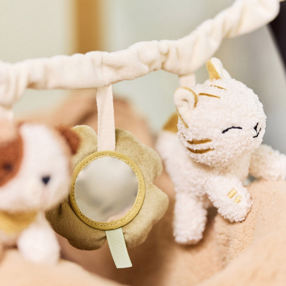 Il set comprende un morbido cane, un gattino e un quadrifoglio dotati di uno specchietto per incoraggiare il bambino a esplorare il proprio riflesso.
