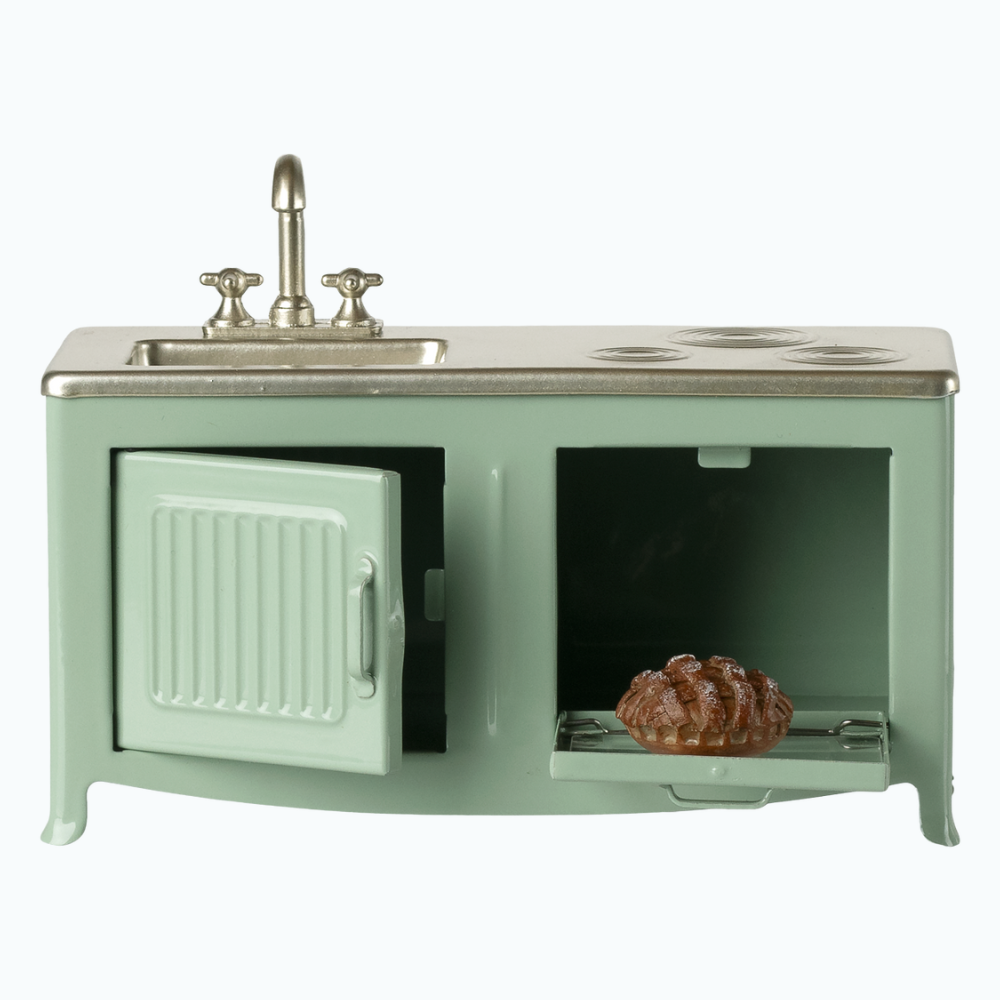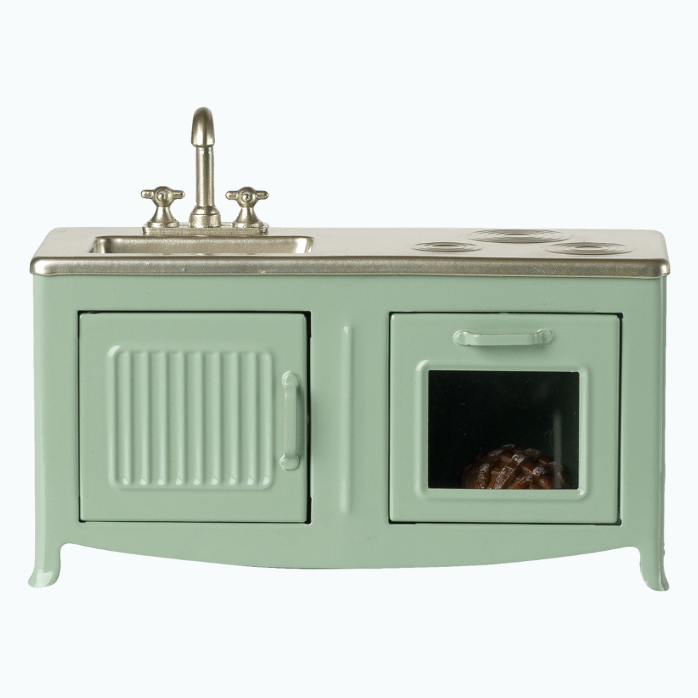 Questa adorabile cucina in metallo è dotata di un'anta, un lavandino e un forno con una torta "cotta": tutto in scala perfetta per una famiglia di topi.