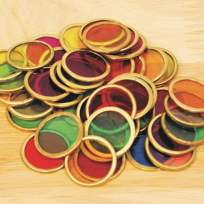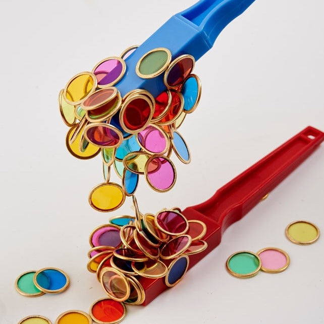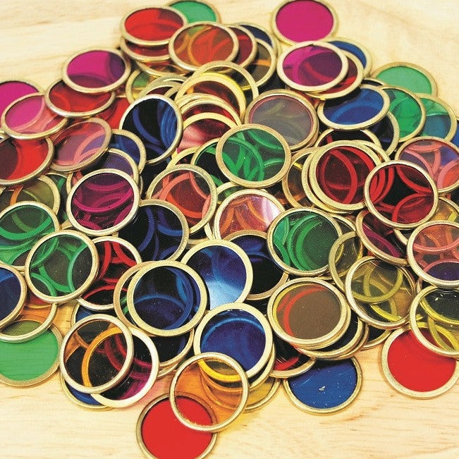 Gettoni trasparenti colorati con cerchi in metallo, ideali per l'uso con le bacchette magnetiche.