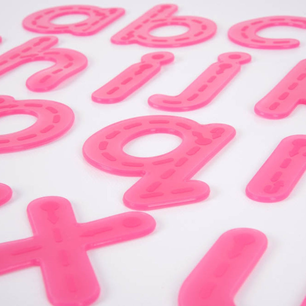 Le lettere rosa traslucide per bambini in silicone morbido e flessibile sono l'aggiunta perfetta al gioco quotidiano.