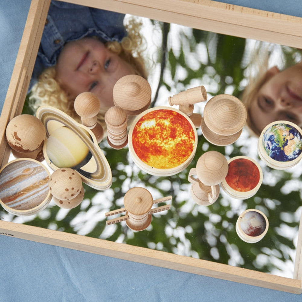 Il vassoio a specchio per bambini in legno di faggio massiccio è ideale per insegnare i riflessi e gli effetti dello specchio, per osservare da vicino gli oggetti di interesse, per giocare con la fantasia e per creare piccoli mondi.