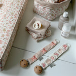 L'elegante clip in legno naturale e metallo privo di nichel consente di fissare saldamente il ciondolo per ciuccio ai vestiti del bambino, proteggendolo dalla caduta e dallo sporco.