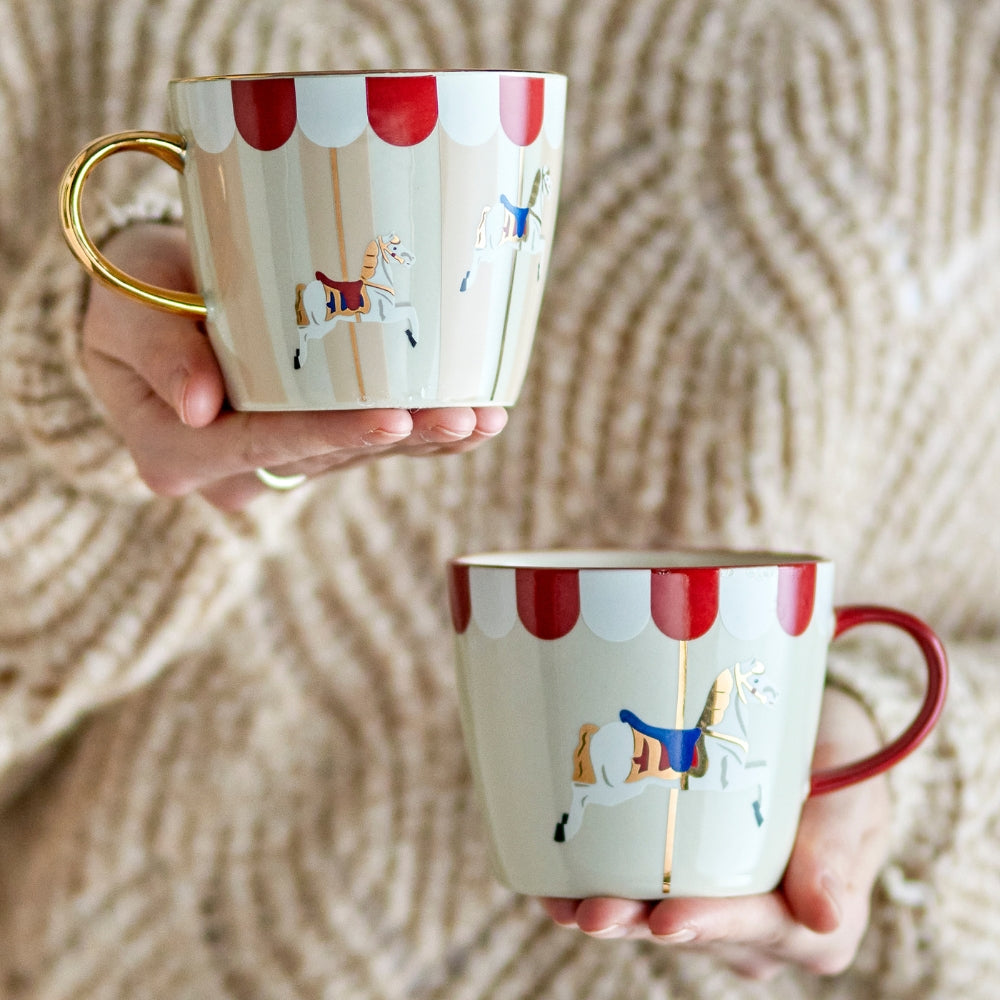 Ogni tazza da caffè è decorata con un motivo a giostra e i dettagli dipinti a mano rendono ogni pezzo unico.