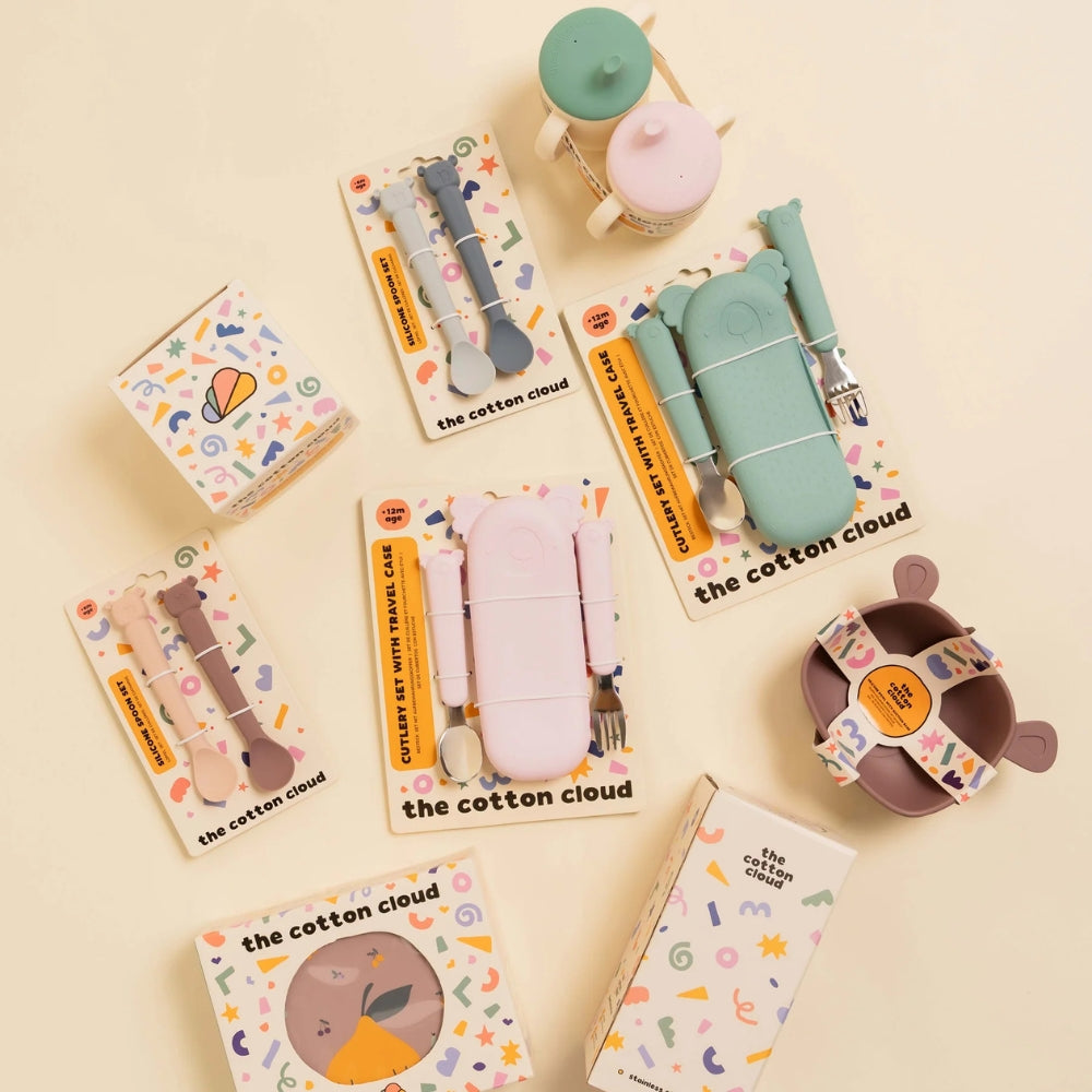 Le posate per bambini Cotton Cloud del set Zoe the Koala rendono l'apprendimento del cibo indipendente un vero piacere per il bambino.