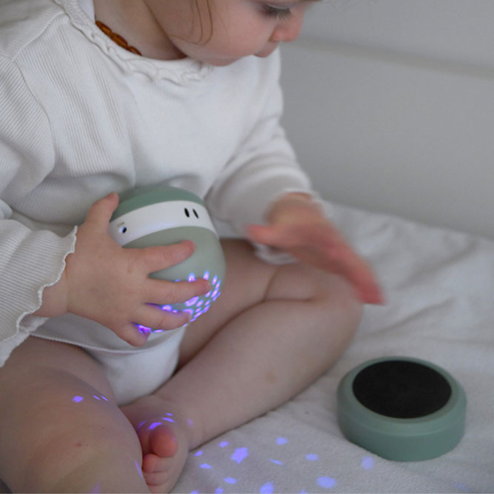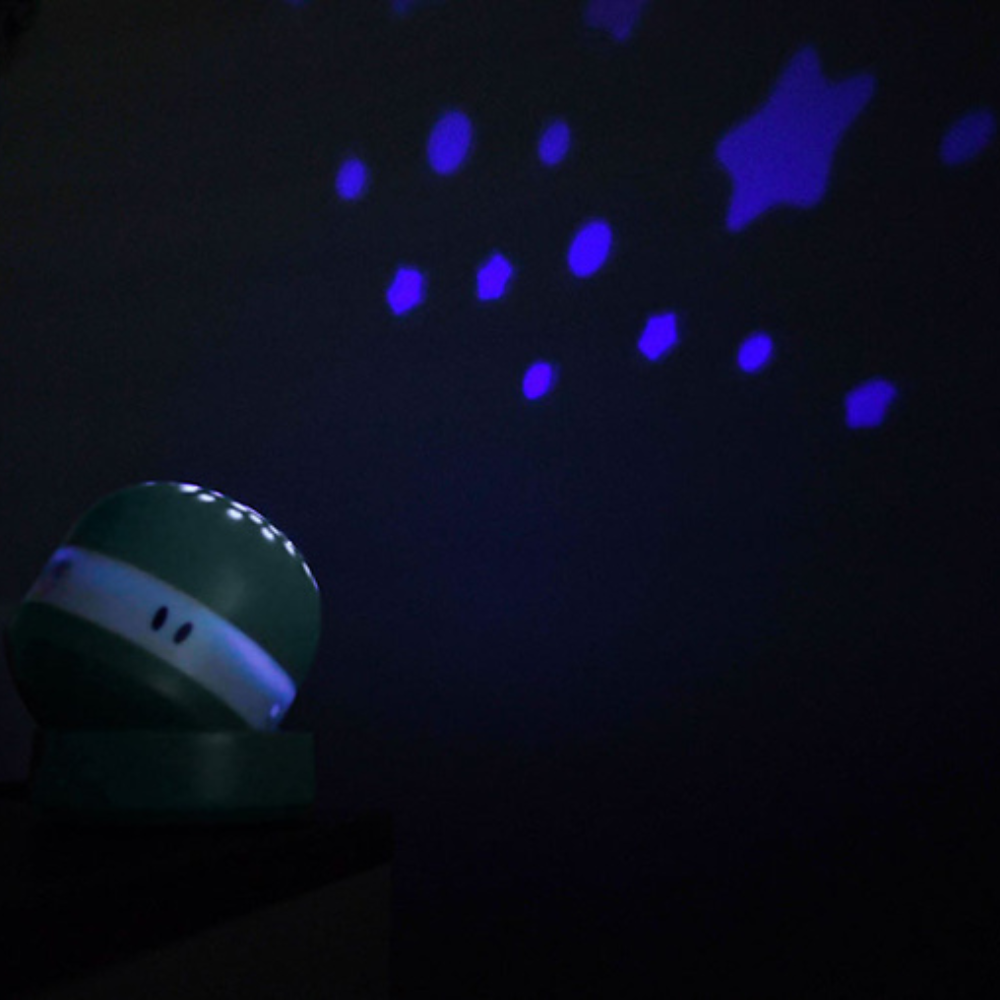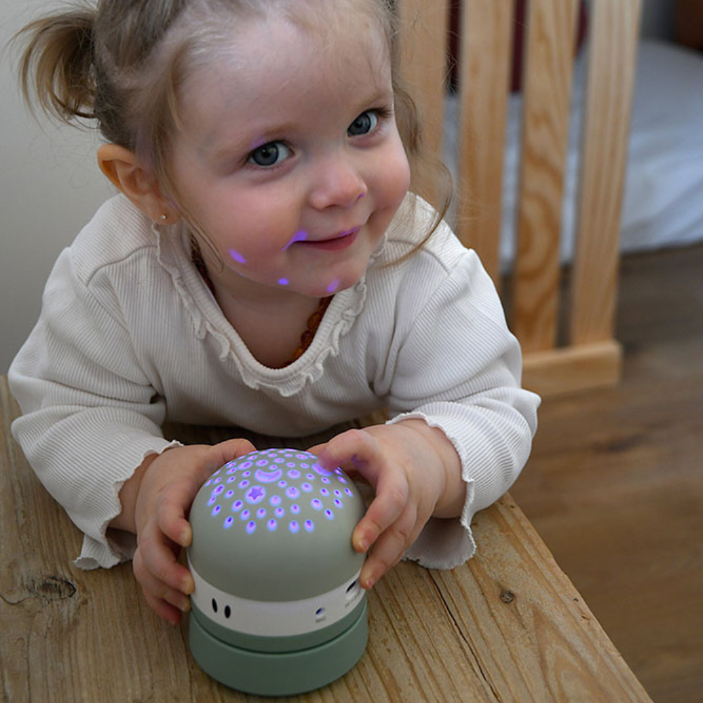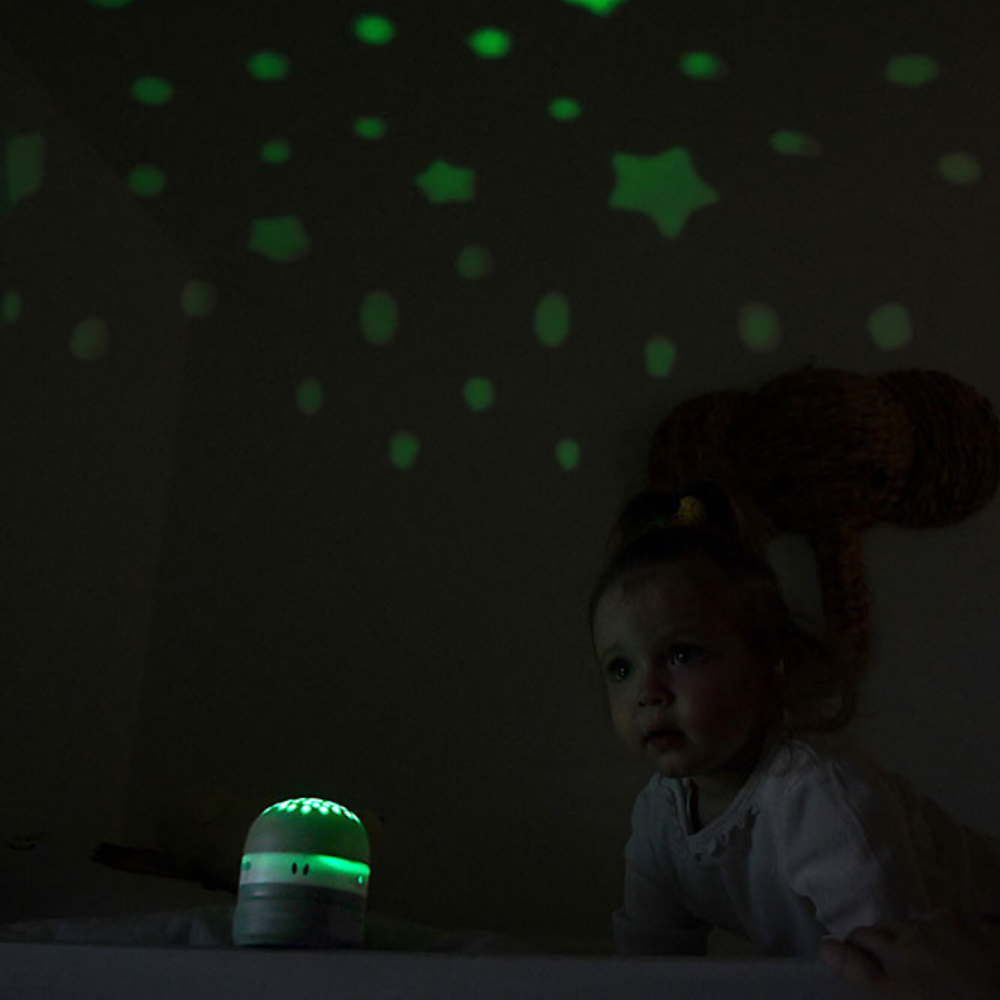 Questo proiettore compatto aiuta il bambino a calmarsi prima della nanna, avvolgendolo in un morbido cielo stellato e in suoni rilassanti.