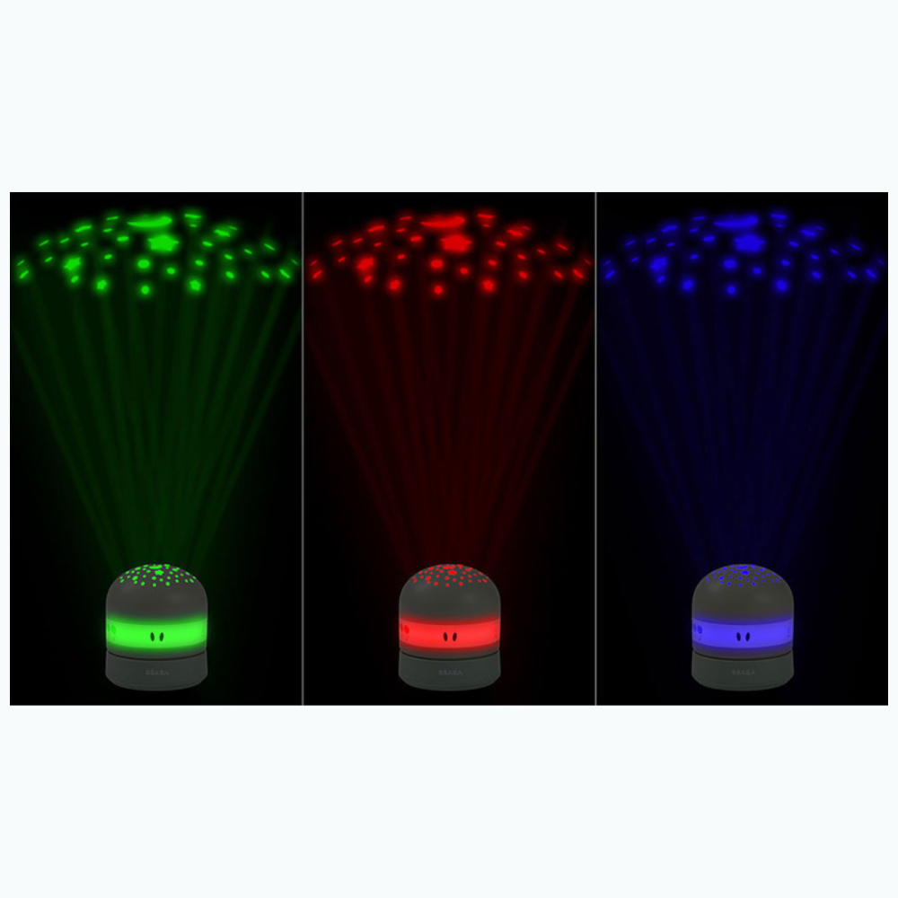 Il dispositivo Beaba proietta stelle in tre colori - rosso, verde e blu - con la possibilità di scegliere tra luce fissa, variabile o casuale. L'angolo di proiezione regolabile consente di orientare l'immagine verso il soffitto, la parete o un punto a scelta, esattamente dove il bambino ama guardare prima di andare a dormire.