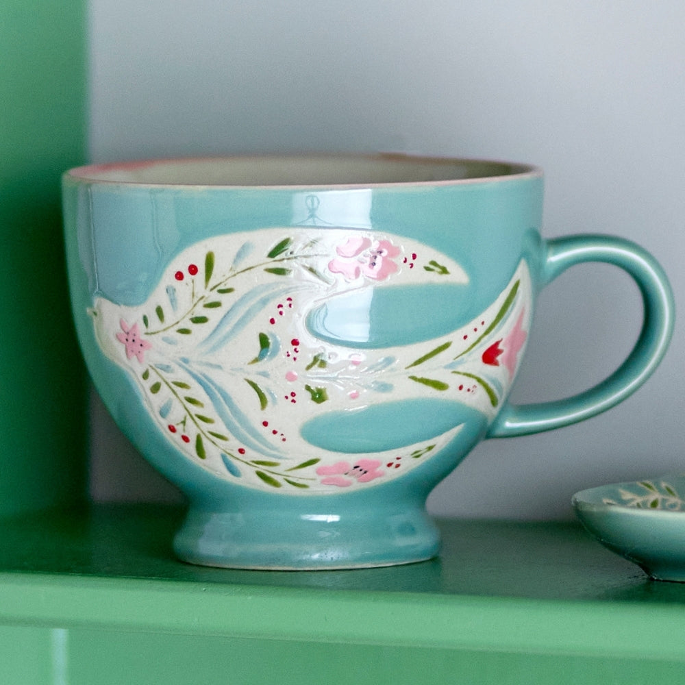 La base delicatamente svasata e il bordo sottilmente rosa aggiungono leggerezza ed eleganza, mentre i motivi dipinti a mano di uccelli, fiori e foglie catturano l'attenzione.