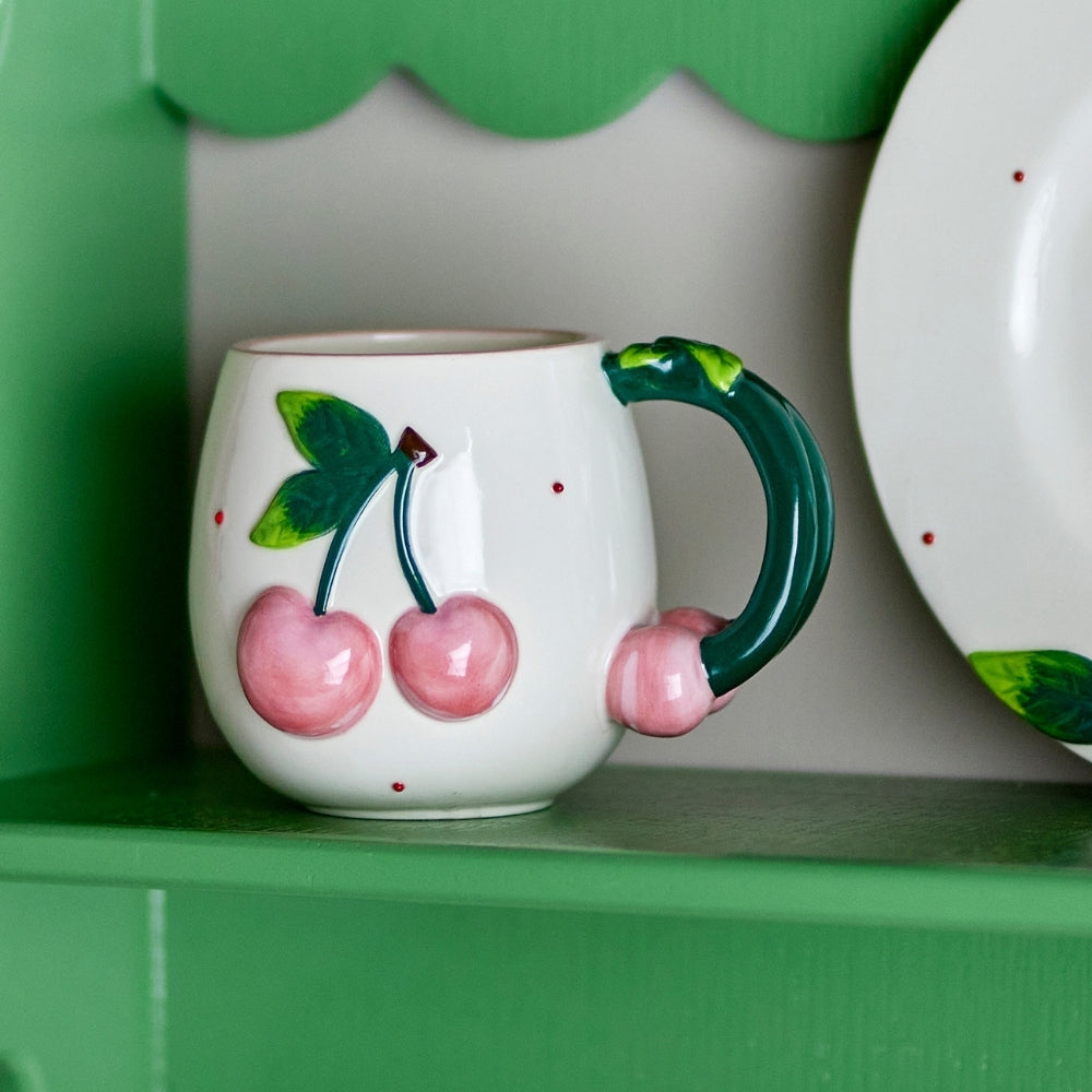 Questa tazza in gres, unica nel suo genere, colpisce per la sua forma arrotondata, la superficie cremosa e il motivo di ciliegie rosa dipinte a mano.
