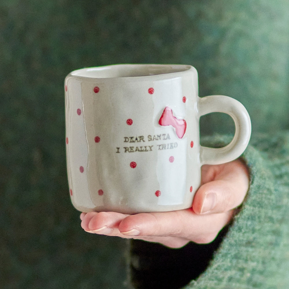 L'affascinante scritta "Caro Babbo Natale, ci ho provato davvero" e i dettagli rossi dipinti a mano rendono ogni tazza unica nel suo genere.