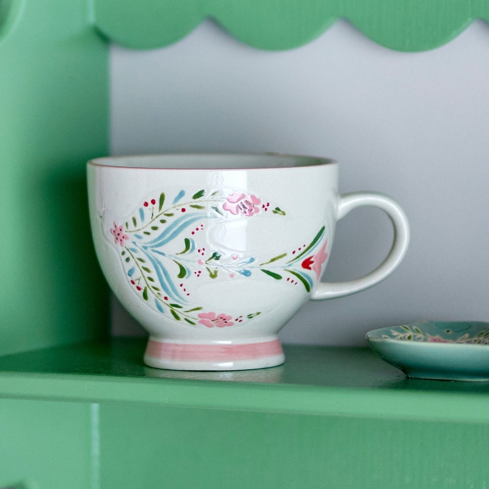 La base delicatamente svasata e il bordo sottilmente rosa aggiungono leggerezza ed eleganza, mentre i motivi dipinti a mano di uccelli, fiori e foglie catturano l'attenzione.