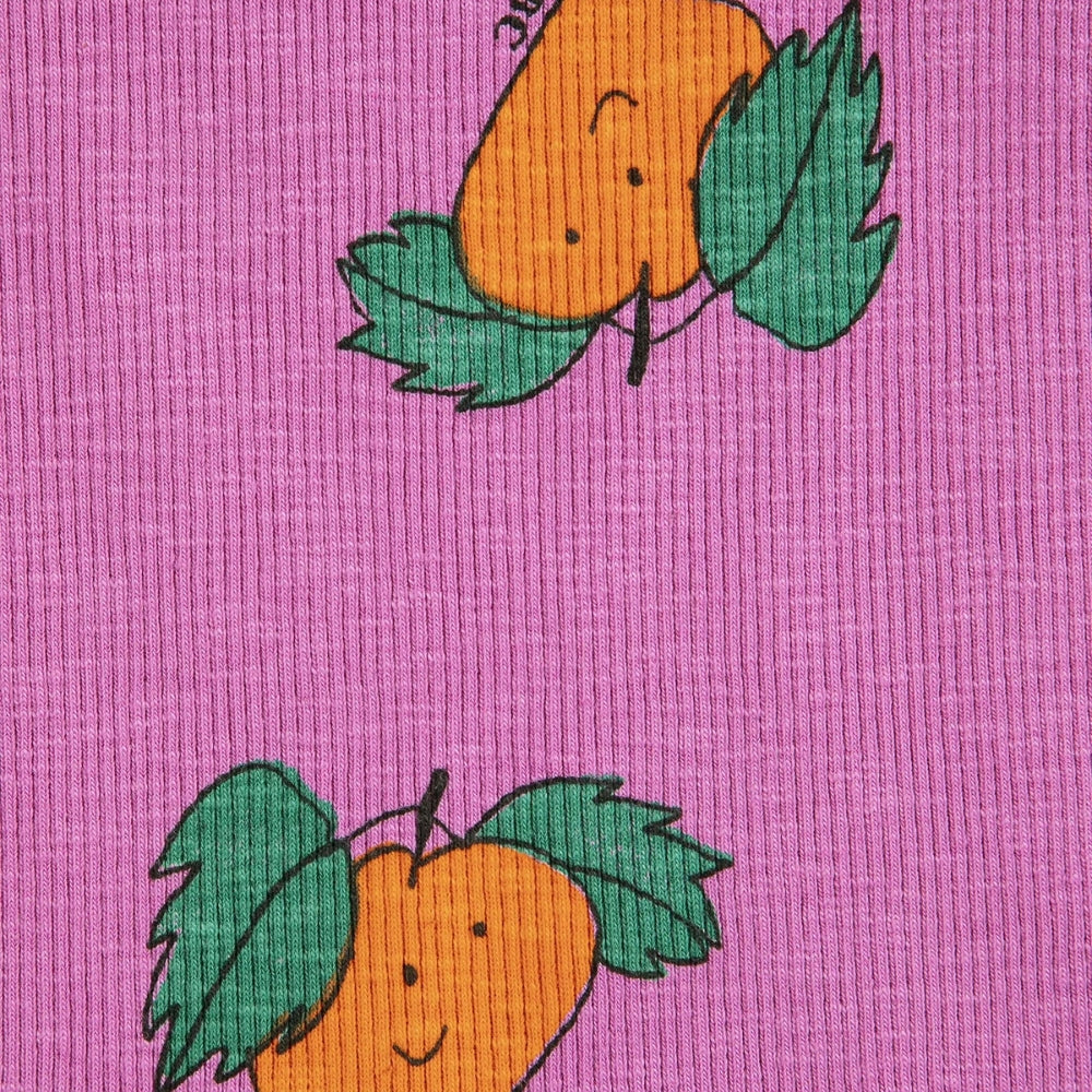 Il taglio ampio e classico garantisce il comfort durante le attività quotidiane, mentre il colore rosa tenue e la stampa infantile color mandarino aggiungono leggerezza e fascino.