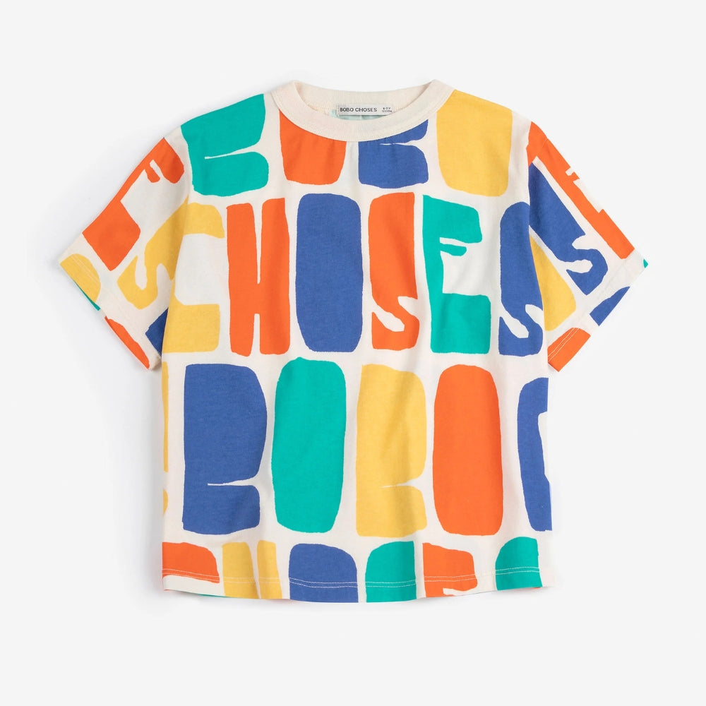 La T-shirt da bambino Bobo Choses è un modello di grande impatto che cattura immediatamente l'attenzione con la sua stampa artistica e colorata.