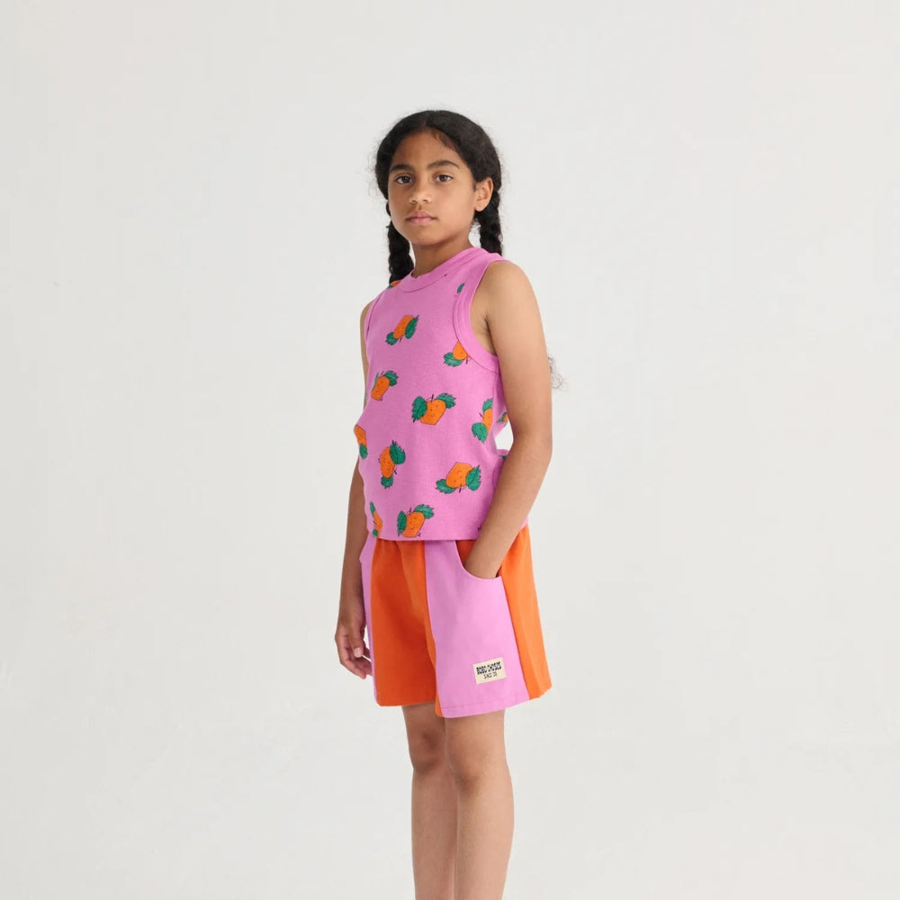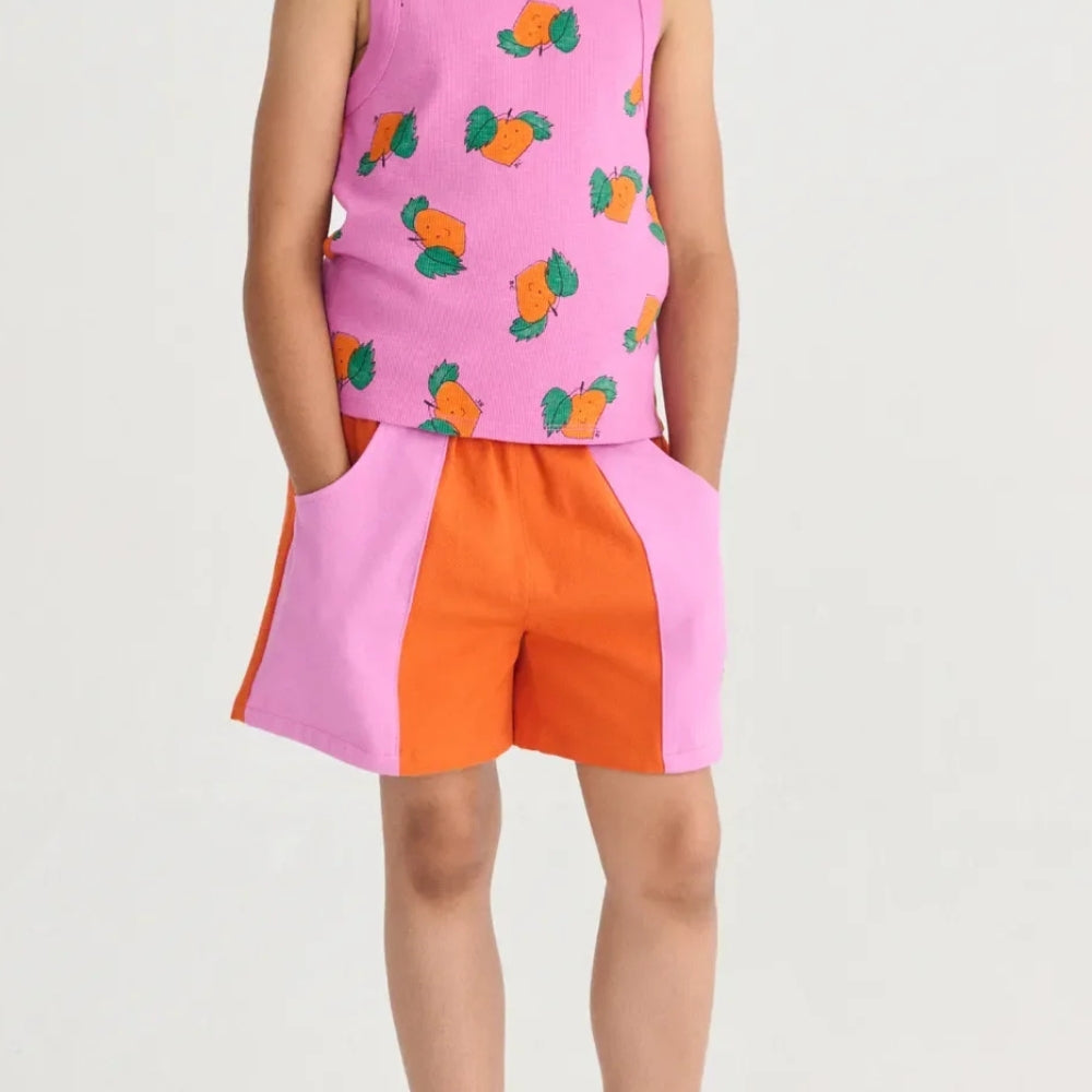 La combinazione di colori rosa e arancione è accattivante e si adatta perfettamente allo stile estivo, mentre la vestibilità sartoriale fa sì che gli shorts da bambina si adattino perfettamente alla figura del bambino.