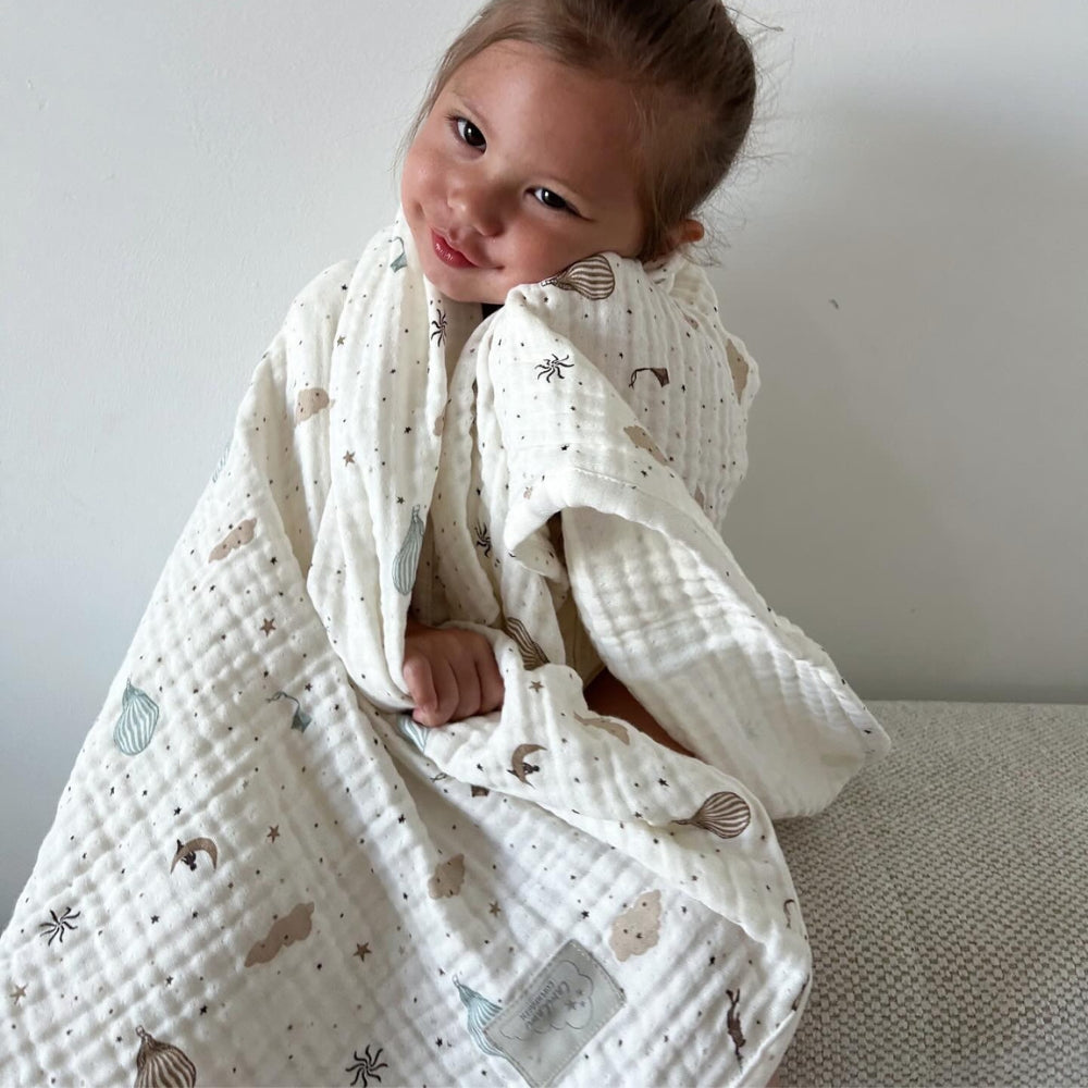 Realizzata con quattro strati di cotone organico arioso e certificato GOTS, la coperta garantisce un'adeguata circolazione dell'aria e un comfort termico, sia in estate che in inverno.