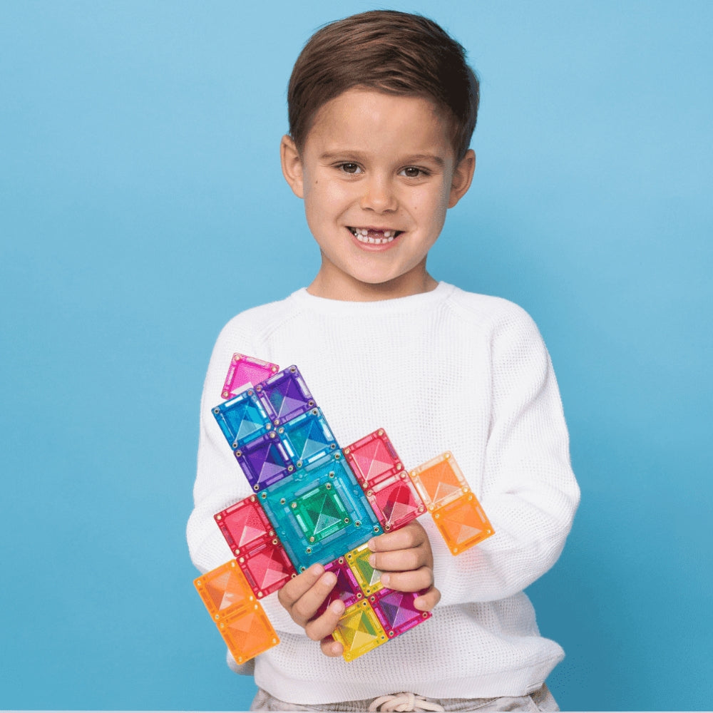 Il pacchetto Torcia-Proiettore Portal Pack di Connetix è costituito da blocchi magnetici in otto colori vivaci e tre dimensioni di quadrati che si inseriscono abilmente l'uno nell'altro.