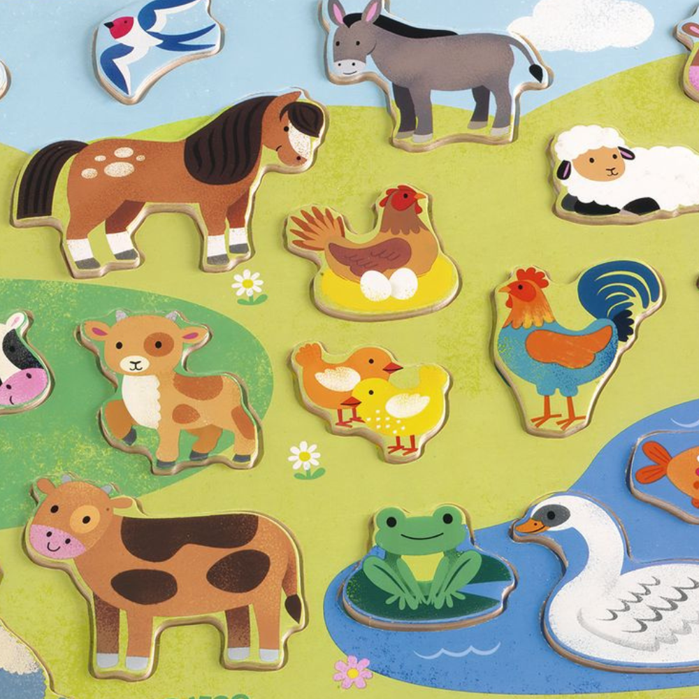 Grazie ai colori vivaci e ai pezzi grandi, il puzzle in legno incoraggia il gioco libero, sviluppa la concentrazione e la motricità fine, ampliando al contempo il vocabolario relativo agli animali e alle loro case.