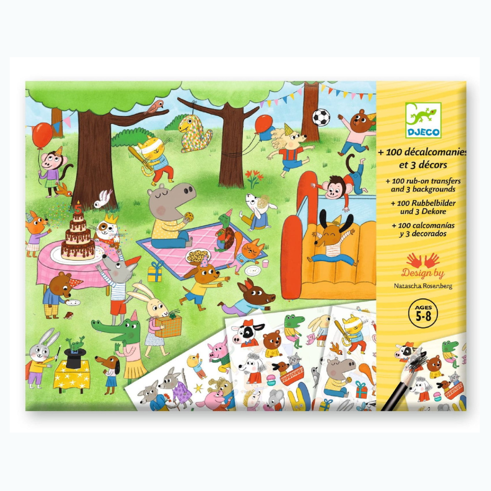 Questo set di decalcomanie di Djeco trasporterà il vostro bambino in un mondo colorato di compleanni, carnevali e feste, pieno di personaggi e scene divertenti che possono essere ricreate più volte.