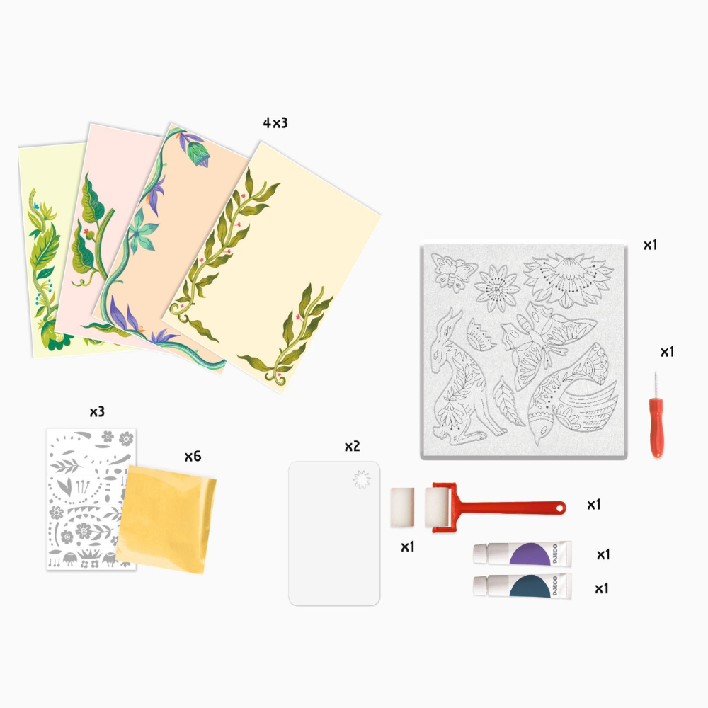 - Contenuto del set: 12 cartoncini illustrati con un motivo floreale, 8 timbri da incidere, 1 punzone, 2 tubetti di colore a guazzo, 2 rulli di gommapiuma, 2 tavolozze, 6 fogli di pellicola trasferibile, 3 fogli con modelli
