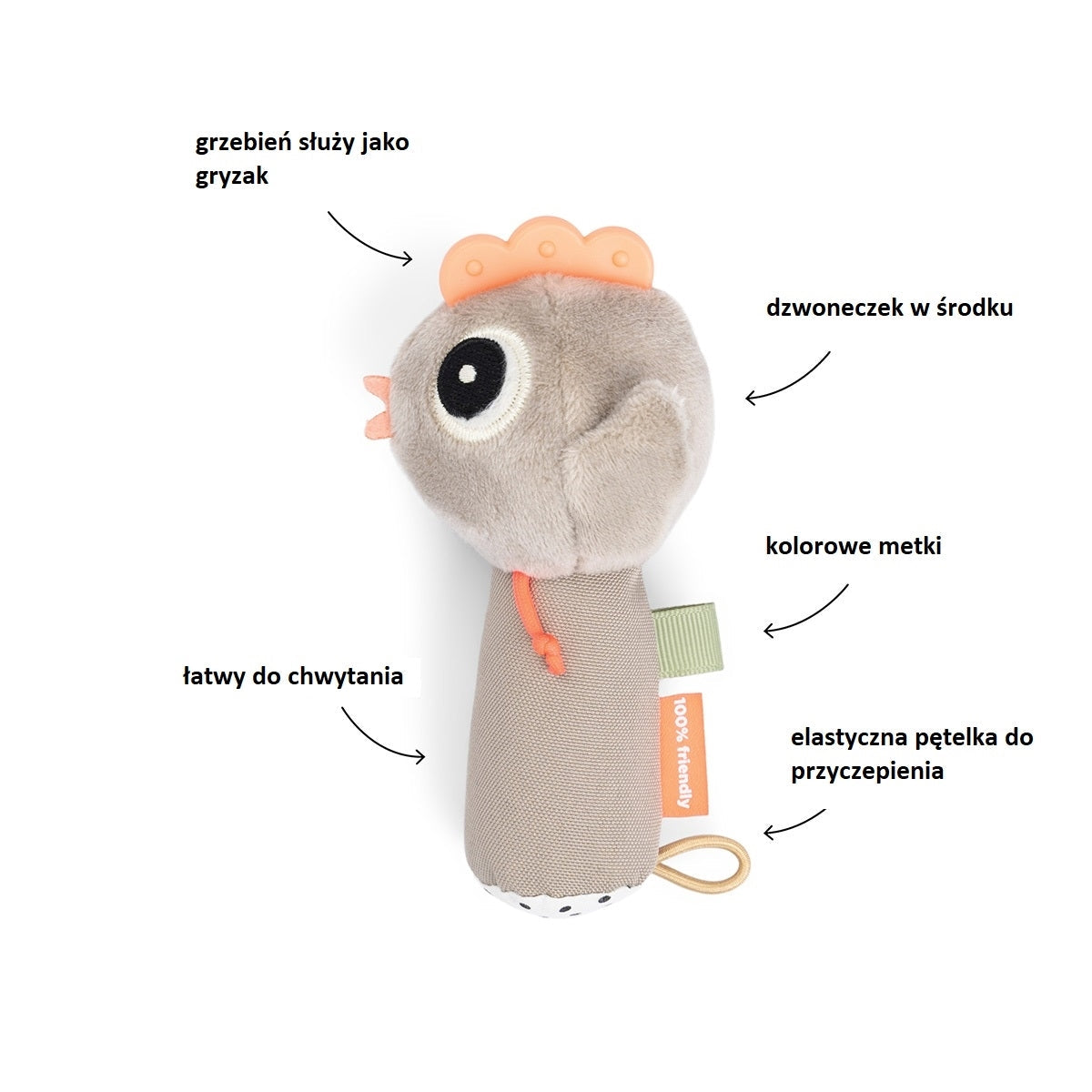 Il sonaglio è stato progettato per sviluppare l'udito, il tatto e la vista, oltre a fornire un sollievo durante la dentizione: il pettine del galletto funge da pratico legaccio per lenire il prurito alle gengive.