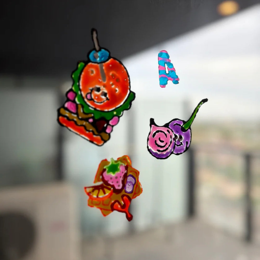 Basta delineare una forma, riempirla di colore, aspettare che si asciughi e staccarla per creare una decorazione brillante che può essere attaccata su una finestra, uno specchio, un vetro o altre superfici lisce.