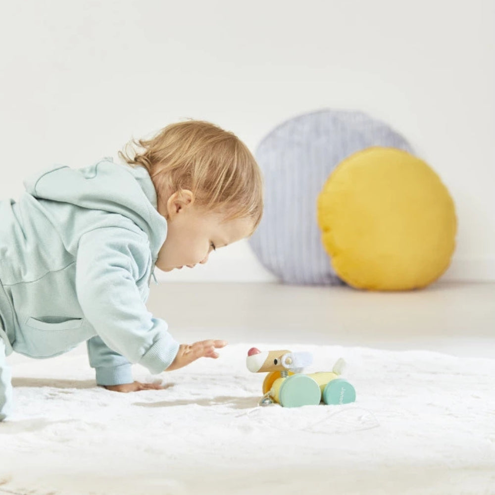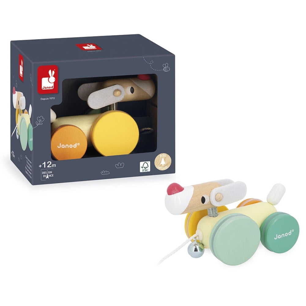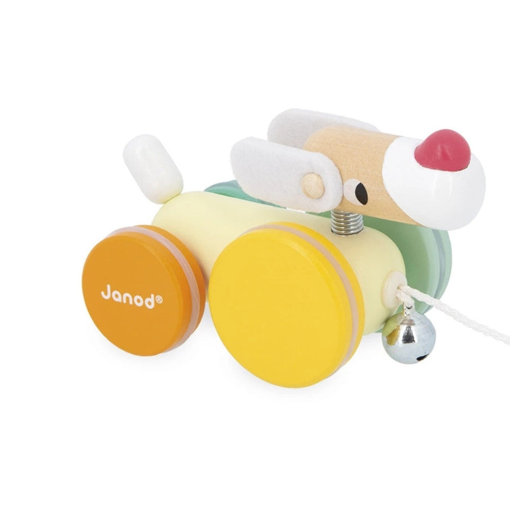 Il giocattolo da tirare Janod è un adorabile e colorato cane a rotelle che sta rapidamente diventando il compagno preferito per le piccole passeggiate.