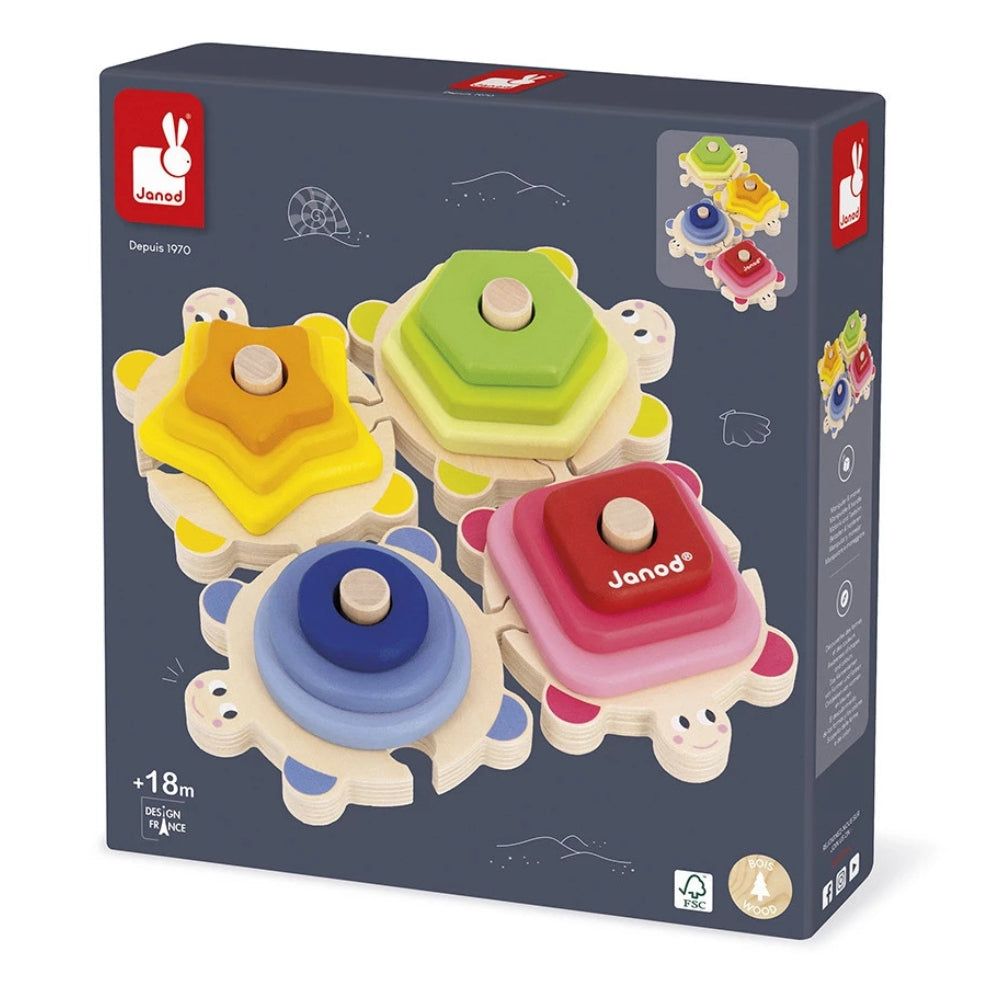 Le piramidi di legno Janod a forma di adorabili tartarughe sono un giocattolo educativo intelligente che incoraggia il bambino a esplorare forme, dimensioni e colori.