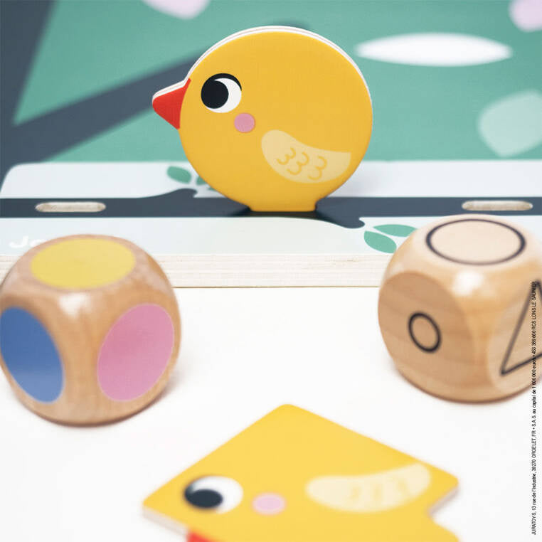 - Il set comprende: due basi di legno a forma di ramoscello, ciascuna con 6 fori per i pezzi, 72 uccelli colorati di diverse dimensioni e forme geometriche e due dadi.