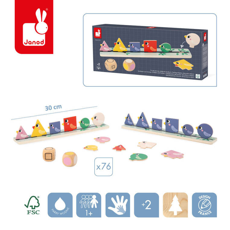 Janod Puzzle educativo Ordinamento di forme, colori e dimensioni Uccelli