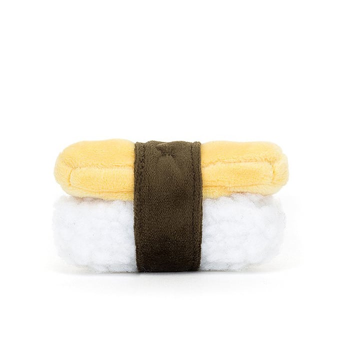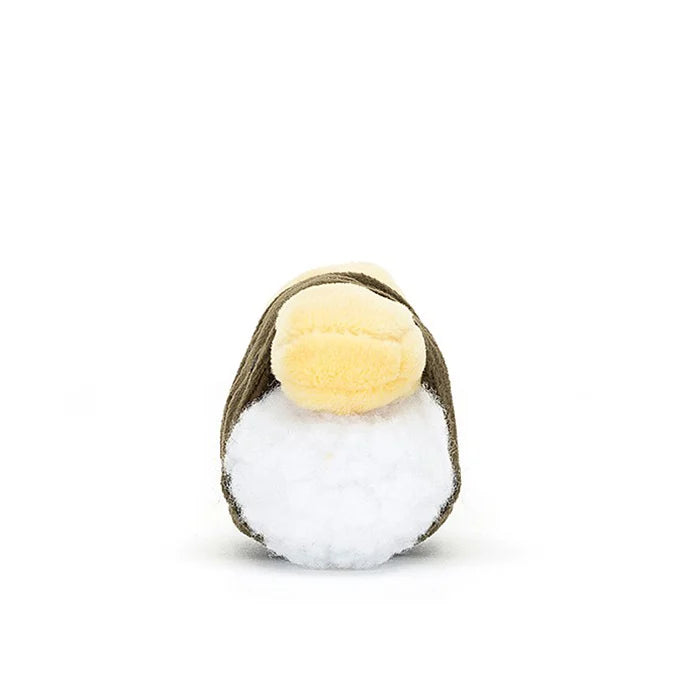 La mascotte Jellycat ha una morbida pelliccia bianca avvolta in un nori verde scuro, un viso sorridente, un pancino morbido e un cappello a forma di frittata di uova.