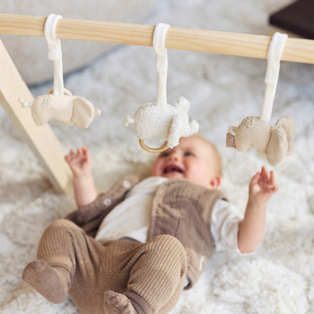 Grazie alle chiusure in velcro di Jollein, è possibile fissarli facilmente all'archetto del tappetino o allo stand educativo.