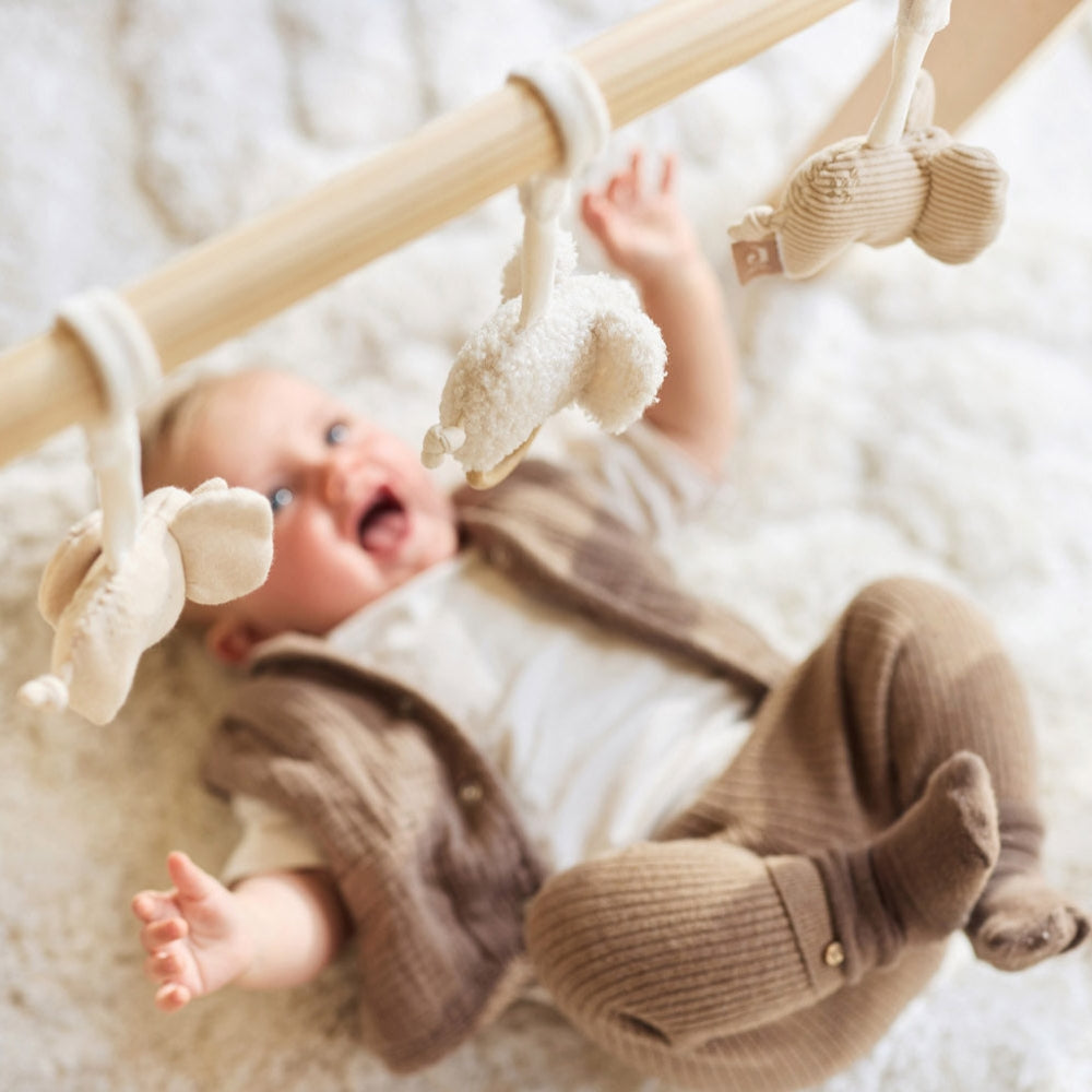 I giocattoli sulla fascia incoraggiano il bambino a osservare, raggiungere ed esplorare il mondo attraverso il tatto, promuovendo lo sviluppo sensoriale.